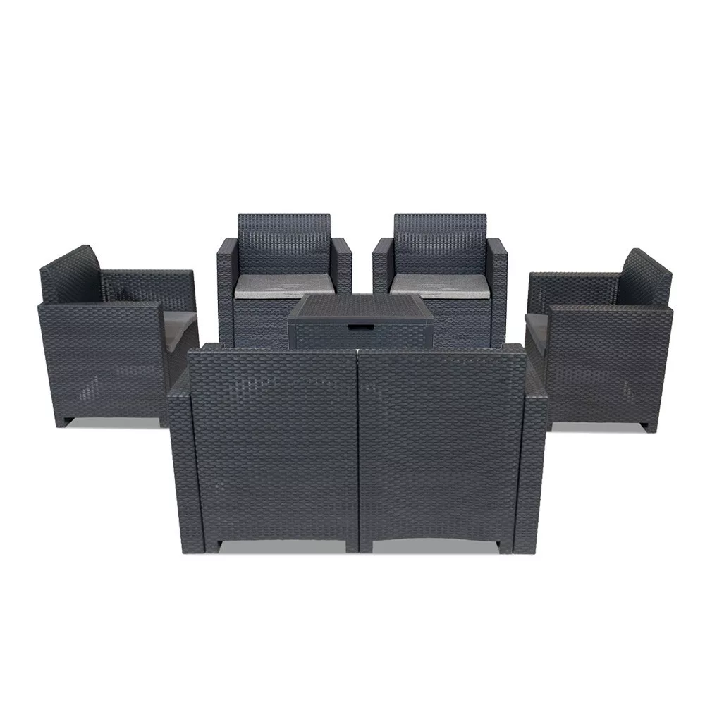 Wyprodukowany we Włoszech w kolorze grafitowym, ten wygodny i stylowy zestaw mebli obejmuje cztery krzesła o wymiarach 57,5x 75x 79 cm, jedną dwuosobową sofę o wymiarach 57,5x 79x 131 cm i jeden prostokątny stół o wymiarach 40x 64x 64 cm. Ten 6-częściowy zestaw mebli ogrodowych zapewnia wystarczającą ilość miejsca dla całej rodziny, aby usiąść w salonie, ale nadal móc spędzać czas na świeżym powietrzu. Jest to również świetny wybór, jeśli lubisz relaksować się i czytać na podwórku w ciągu dnia, rozłożony na sofie. Nadaje się do spotkań rodzinnych i wydarzeń biznesowych, ponieważ przekształcakażdą przestrzeń w nowoczesną i przytulnąprzestrzeń.
