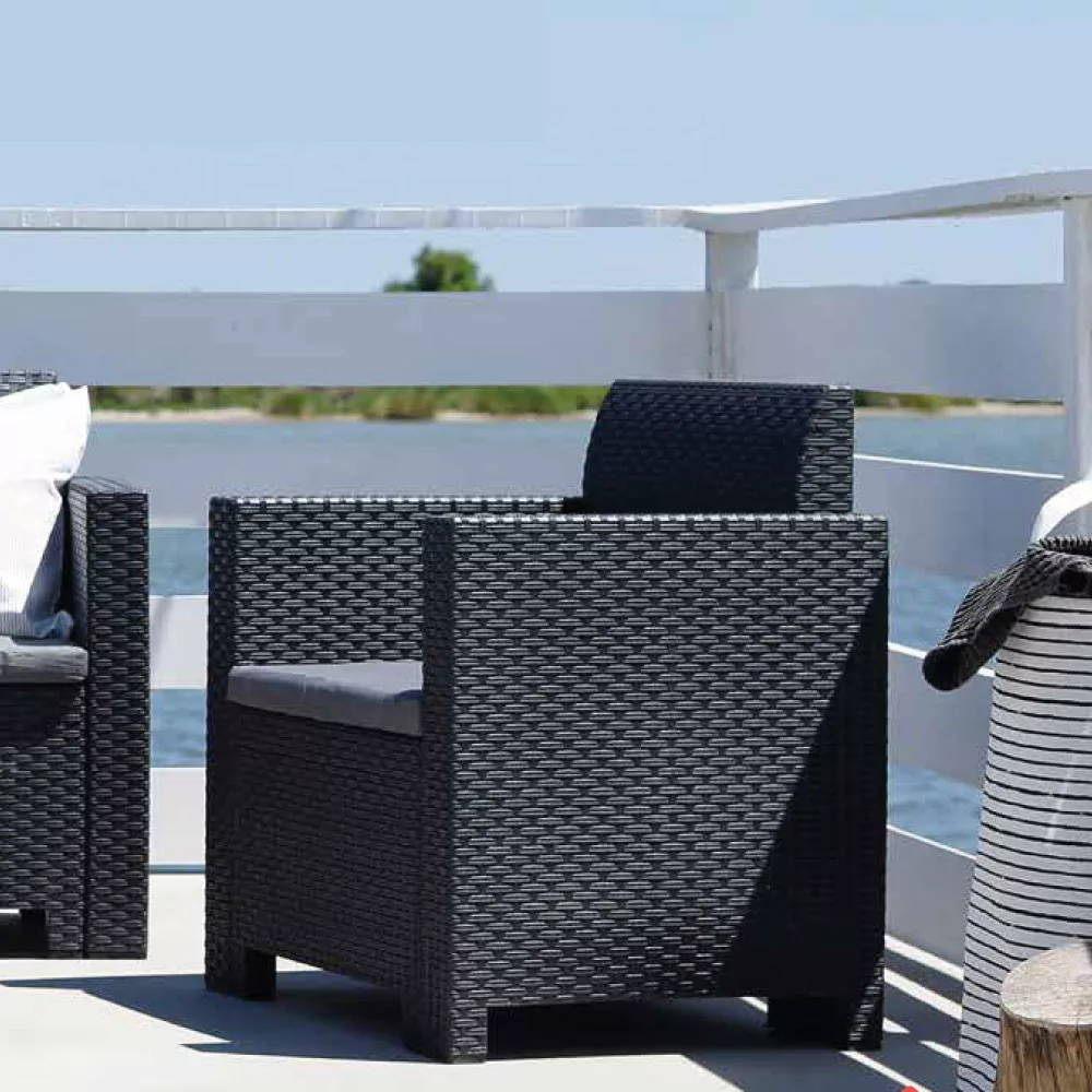 Zestaw ten wykonany jest z tworzywa sztucznego odpornego na szkodliwe działanie promieni UV i czynników atmosferycznych. Jest to zatem trwały, ponadczasowy wybór, który może być używany przez cały rok. Zestaw mebli jest idealny do każdej przestrzeni zewnętrznej, gdzie tworzy idealne miejsce do relaksu i rozrywki na świeżym powietrzu, ale może być również używany do stworzenia idealnej atmosfery salonu na tarasie restauracji. Jego naturalne wykończenie inspirowane splotem rattanowym jest jedną z zalet estetycznych produktu.