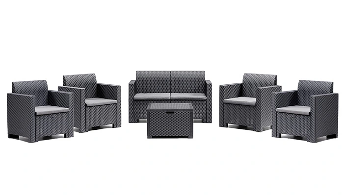 Wysokiej jakości meble ze sztucznego rattanu są łatwe do czyszczenia wodą lub łagodnymi środkami chemicznymi, dzięki materiałowi, z którego są wykonane i łatwości czyszczenia. Meble te są odporne na warunki atmosferyczne, mogą być wygodnym meblem ogrodowym lub tarasowym przez cały rok, są odporne na szkodliwe działanie promieni słonecznych i nie tracą koloru. Ciemny kolor mebli nie uwidacznia zabrudzeń, a szary kolor poduszek ułatwia ich czyszczenie. Poduszki można również prać.