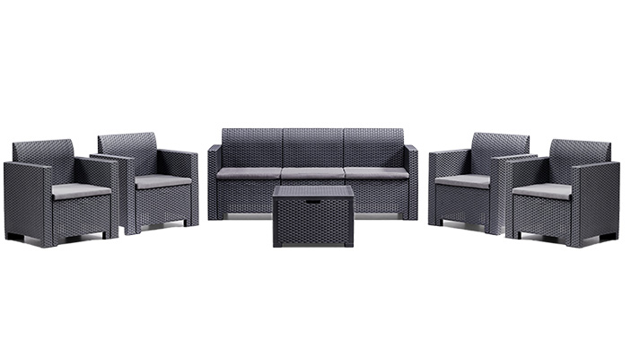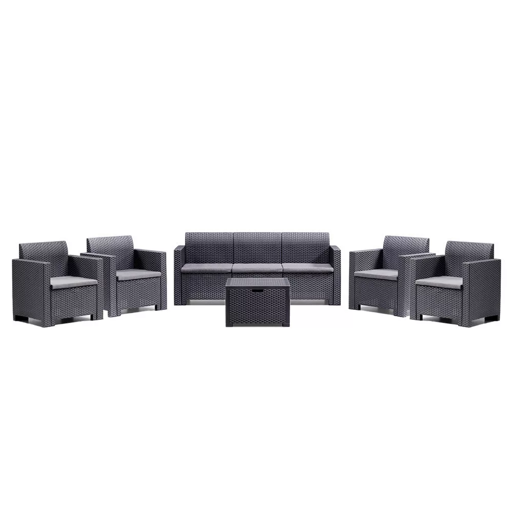 Wykonany z tworzywa sztucznego odpornego na promieniowanie UV i warunki atmosferyczne. Zestaw mebli jest idealny do każdej przestrzeni wokół domu, gdzie tworzy idealne miejsce do relaksu na świeżym powietrzu. Jego naturalna powierzchnia inspirowana splotem rattanowym jest jedną z zalet estetycznych produktu.