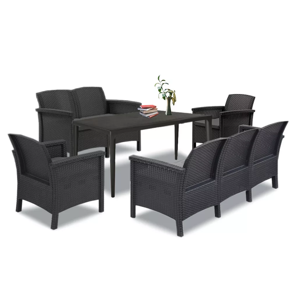 Ten zestaw mebli obejmuje dwa plastikowe krzesła ogrodowe Venus, plastikowy stół ogrodowy Odina, 2-osobową sofę ogrodową Venus i 3-osobową sofę ogrodową Venus, które razem spełnią wszystkie Twoje oczekiwania pod względem komfortu, funkcjonalności i stylu.