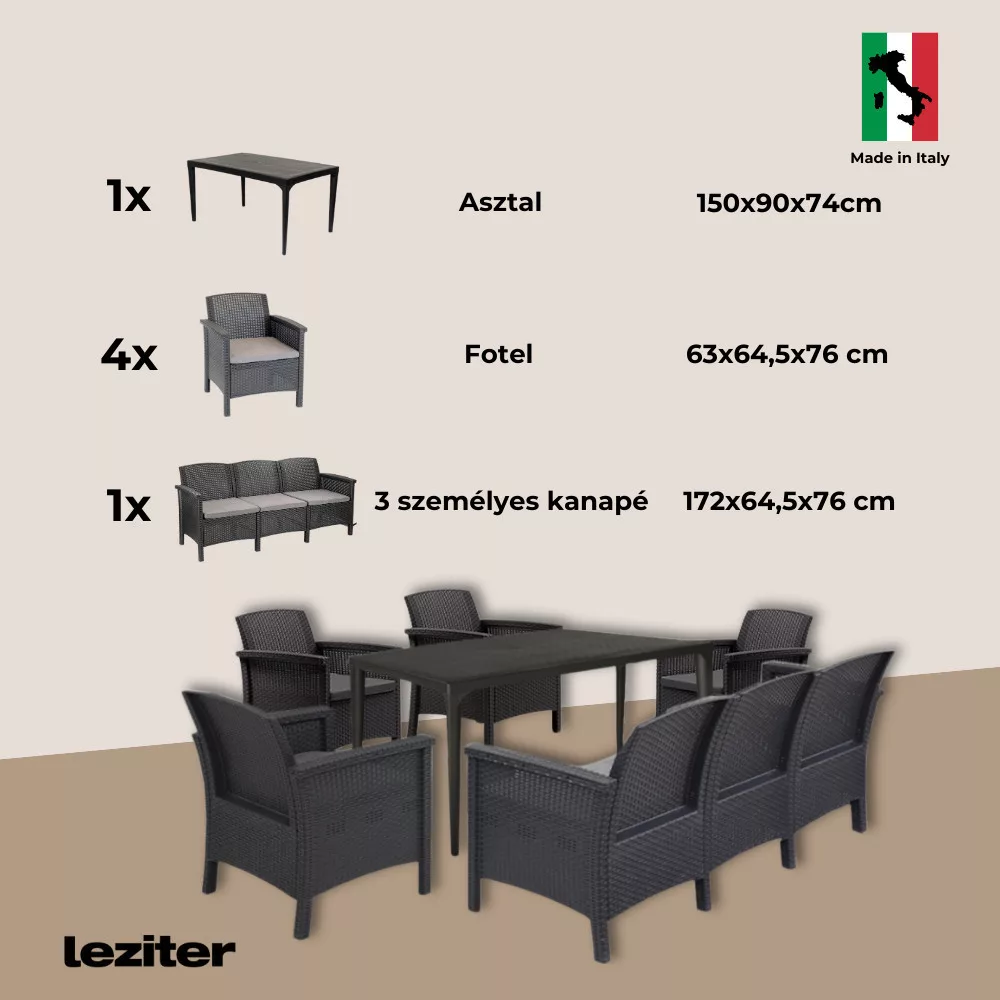 Trzyosobowasofa ogrodowaVenus jest dostarczana w komplecie z poduszką. Ta duża, wygodna sofa o wymiarach 64,5 x 76 x 172 cm wygląda idealnie w każdym otoczeniu, a grafitowy kolor i oryginalne wykończenie przypominające rattan można dopasować do wielu stylów wnętrz. Mebelwykonany jest z odpornego napromieniowanie UV i warunki atmosferyczne tworzywa sztucznego , dzięki czemu stanowi ponadczasowy, trwały wybór. Są również niezwykle łatwe w czyszczeniu i jeszcze łatwiejsze w montażu.