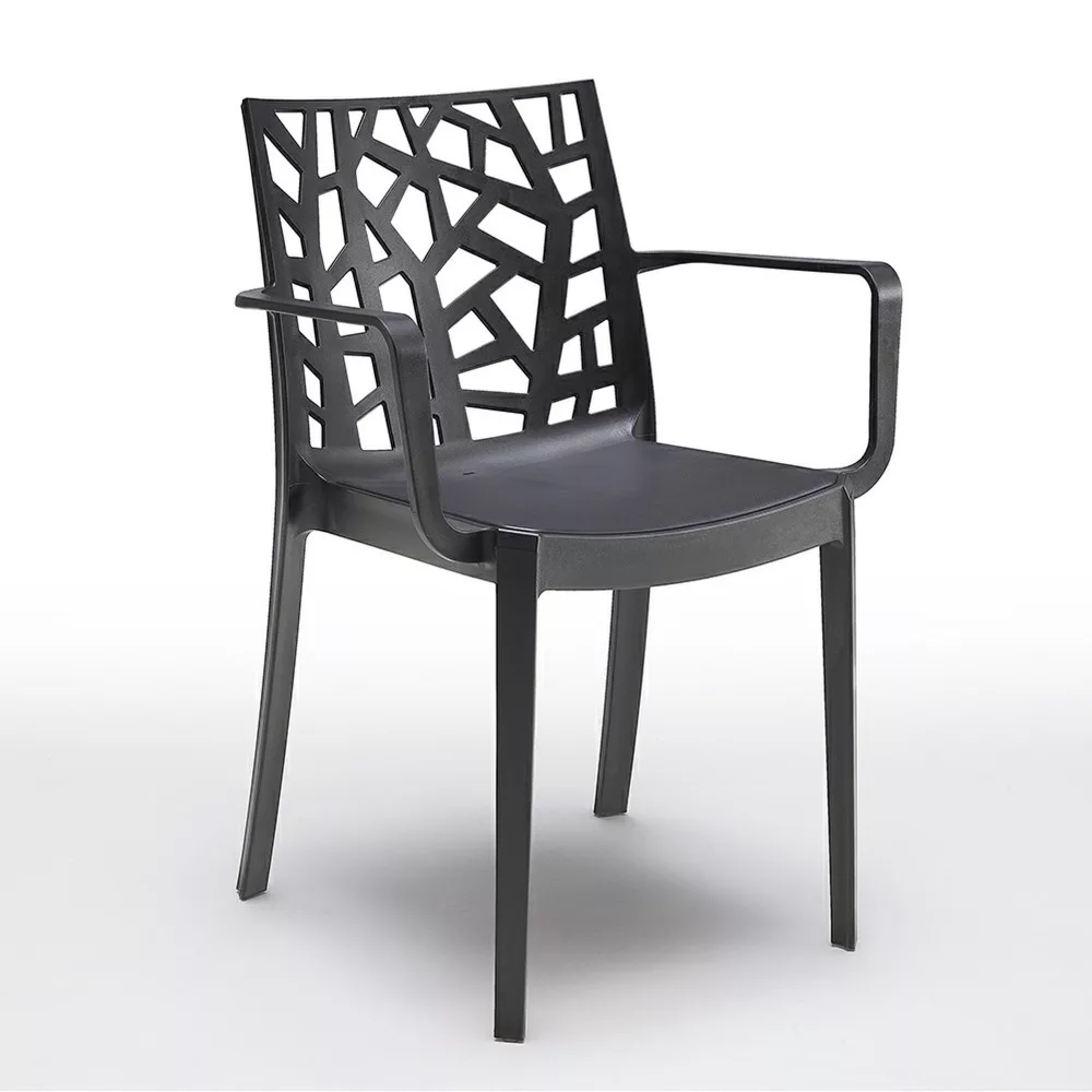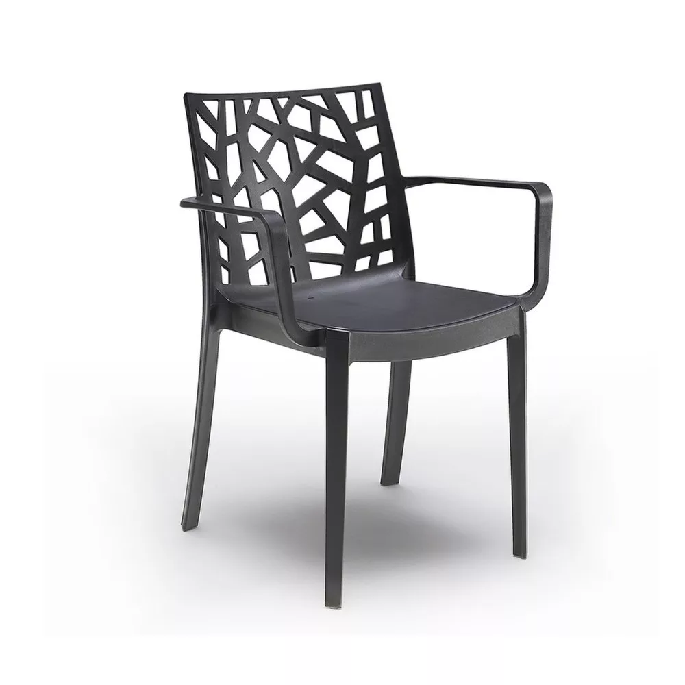 To krzesło ogrodowe o wyjątkowym designie. Grafitowy kolor i nowoczesne wykończenie przypadną do gustu większości użytkowników. Wykonano go z wytrzymałego tworzywa sztucznego, które jest odporne na działanie czynników atmosferycznych i promieni UV. Łatwy w utrzymaniu czystości i bardzo prosty w montażu.Dzięki eleganckiemu designowi zmieści się na niewielkich balkonach lub tarasach, a wraz z pasującym stołem może zostać przekształcony w nowoczesny stół jadalniany. Świetnie wygląda w salach konferencyjnych, na tarasach restauracji, w kawiarniach zarówno wewnątrz, jak i na zewnątrz.
