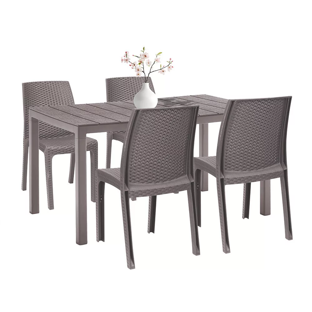 Elegancki wygląd, maksymalna odporność na warunki atmosferyczne, bezkompromisowy komfort. Zestaw mebli ogrodowych Laos 4+1, składający się z 4 plastikowych krzeseł Vanda i 1 plastikowego stołu Tulsa. Zestaw, który zapewni lata doskonałego relaksu na świeżym powietrzu, czy to w przydomowym ogrodzie, czy w restauracji.