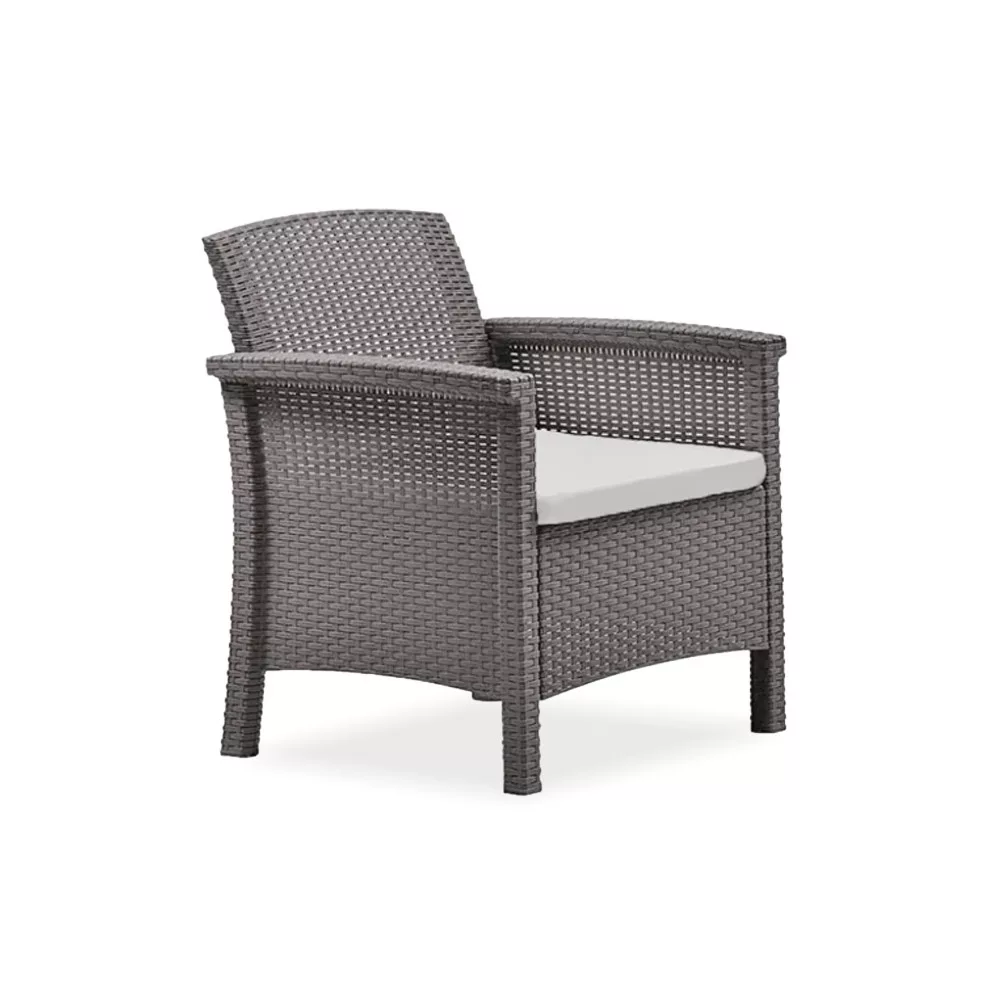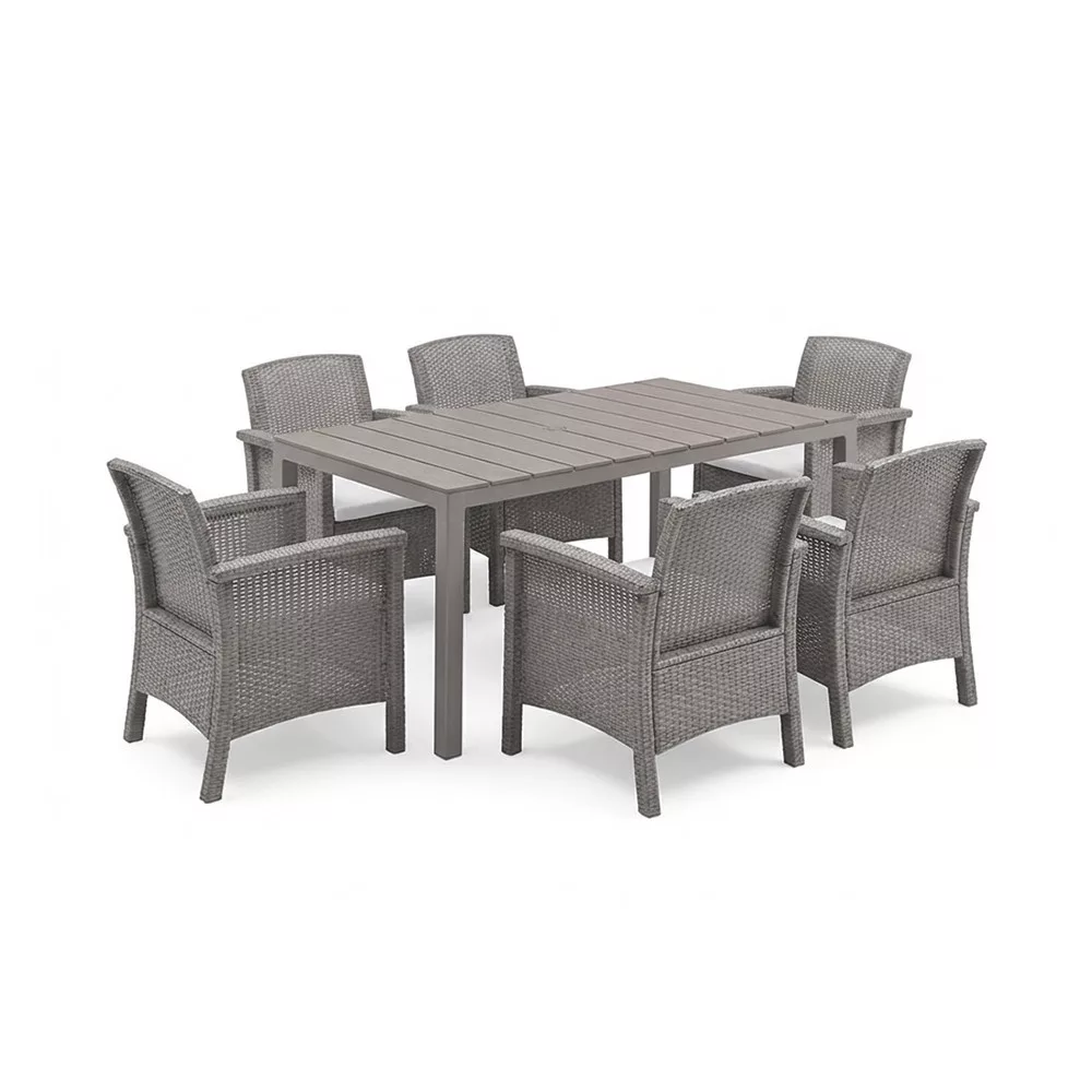A garnitúrához 6 db Venus karfás műanyag szék tartozik, amelyek rattan hatású felületükkel és ergonomikus kialakításukkal nemcsak látványos, hanem igazán kényelmes megoldást nyújtanak a szabadtéri időtöltéshez. A kényelmet a tartozék szürke ülőpárna teszi teljessé – ideális egy hosszú ebédhez vagy egy baráti beszélgetéshez a kertben.