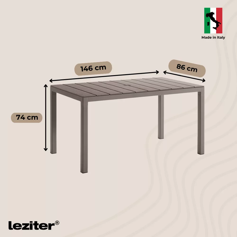 Plastikowy stół ogrodowy Tulsa ma wymiary 146 x 86 x 74 cm i jest idealny dla 6 osób. Kompaktowy, ale przestronny, nie zajmuje dużo miejsca, ale zapewnia wystarczająco dużo miejsca na wygodny posiłek na świeżym powietrzu lub spotkanie z przyjaciółmi. Wykonany z ponadczasowego tworzywa sztucznego w nowoczesnym kolorze taupe, nie musisz się martwić o blaknięcie, rdzę lub uszkodzenia spowodowane wodą. Ochrona przed promieniowaniem UV zapewnia, że zachowa swój oryginalny wygląd przez wiele lat, a łatwa do czyszczenia powierzchnia ułatwia codzienną konserwację.
