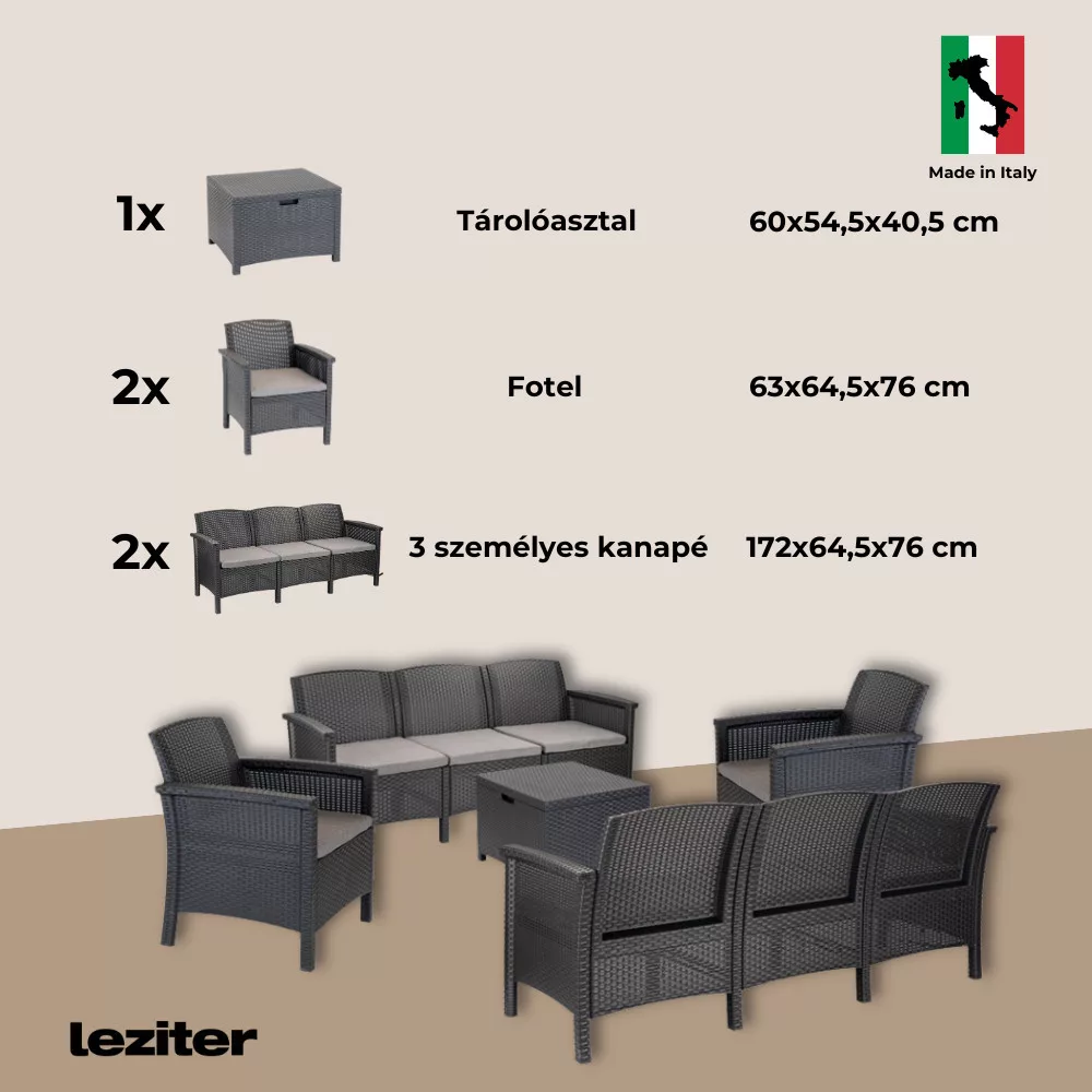 Ten wygodny i elegancki zestaw mebli w kolorze grafitowym, wyprodukowany we Włoszech, obejmuje dwakrzesła 63 x 64,5 x 76 cm, dwie sofy dla trzech osób 172 x 64,5 x 76 cm i prostokątny stół 60 x 54 x 41 cm. Ten 7-częściowy zestaw mebli ogrodowych może być niezwykle przydatny, jeśli chcesz cieszyć się czasem na świeżym powietrzu z przyjaciółmi lub rodziną.