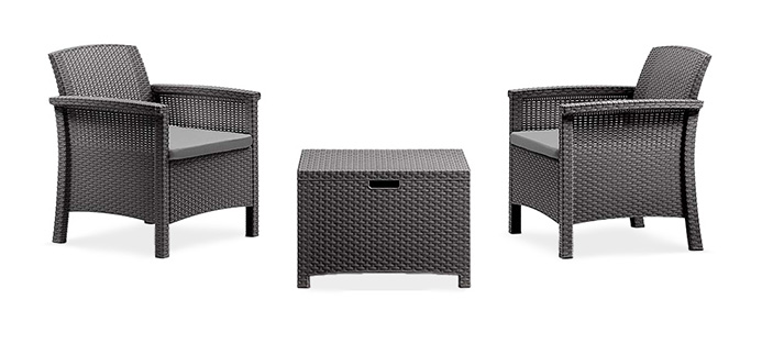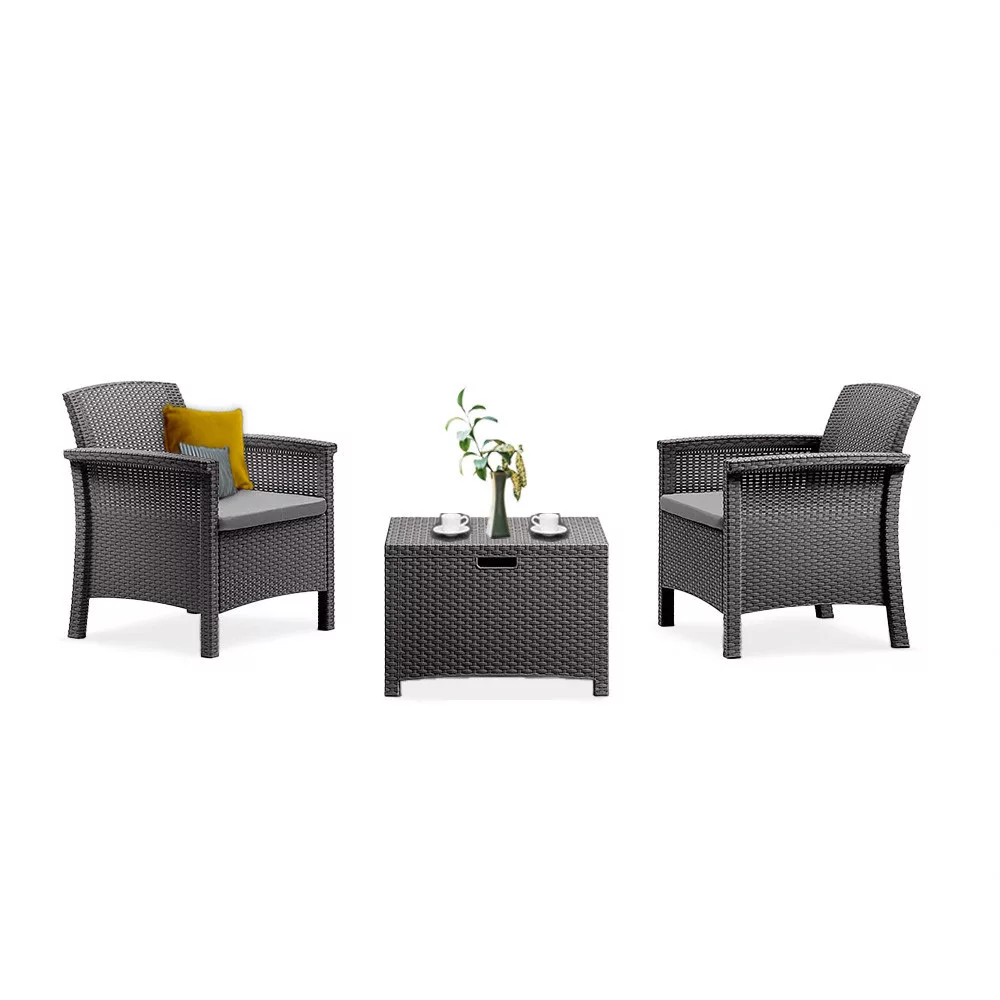 Zestaw mebli ogrodowych z efektem rattanu w kolorze grafitowym składa się z dwóch foteli o wymiarach 63 x 64,5 x 76 cm i prostokątnego stołu o wymiarach 60 x 54,5 x 40,5 cm. Jest to wysokiej jakości produkt wykonany z tworzywa sztucznego odpornego na warunki atmosferyczne, dzięki czemu nie musisz się martwić, że zostanie "zjedzony przez UV".