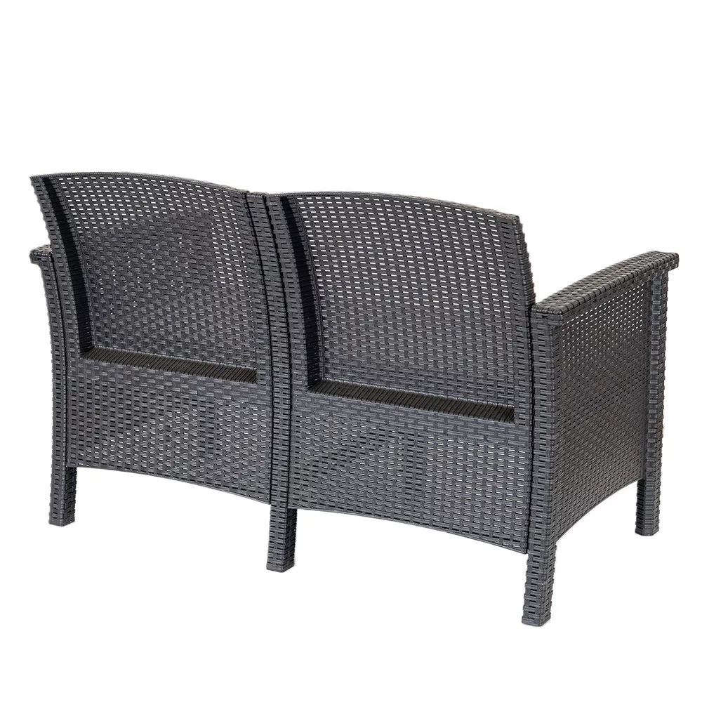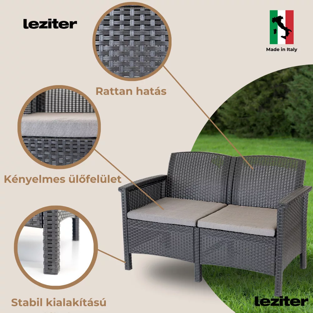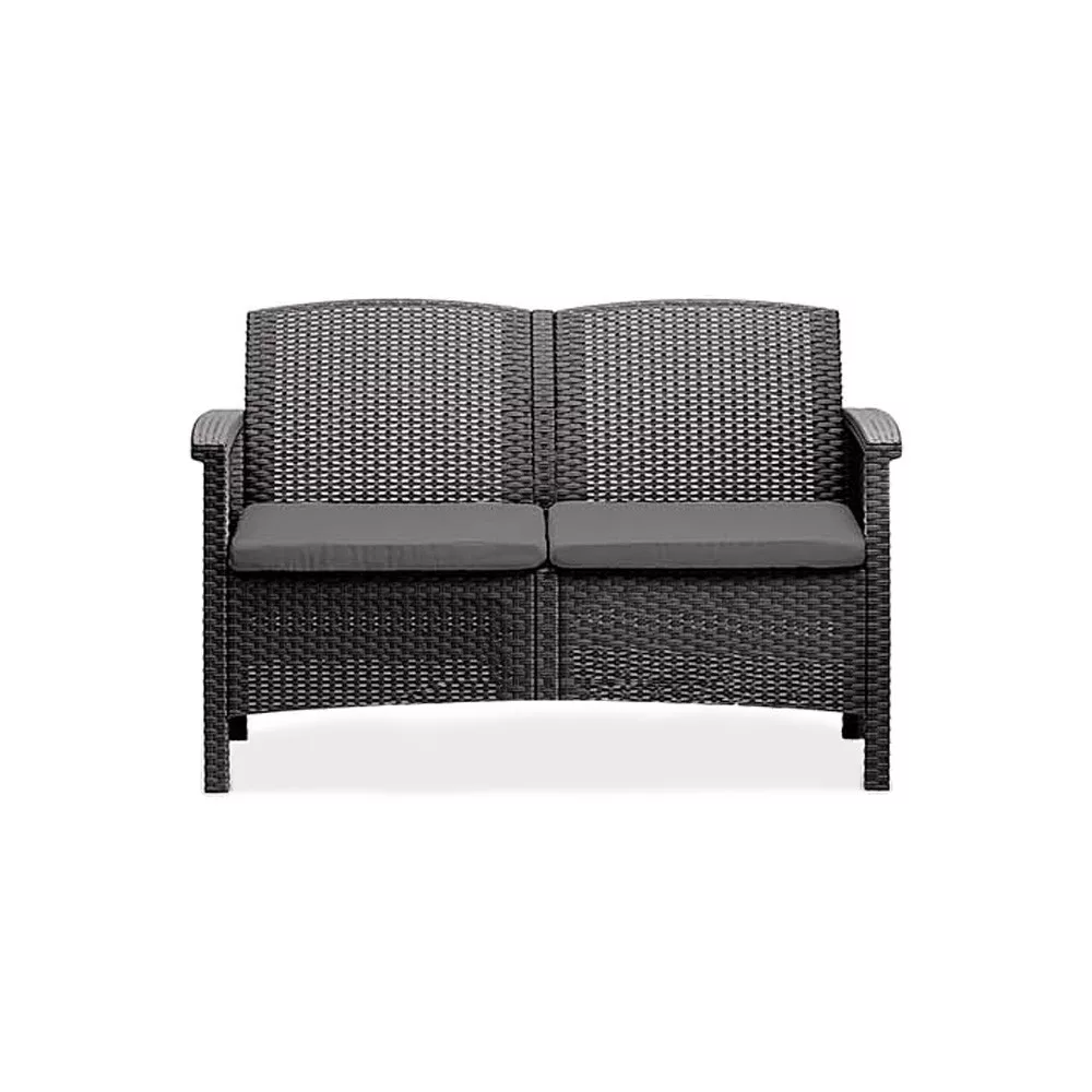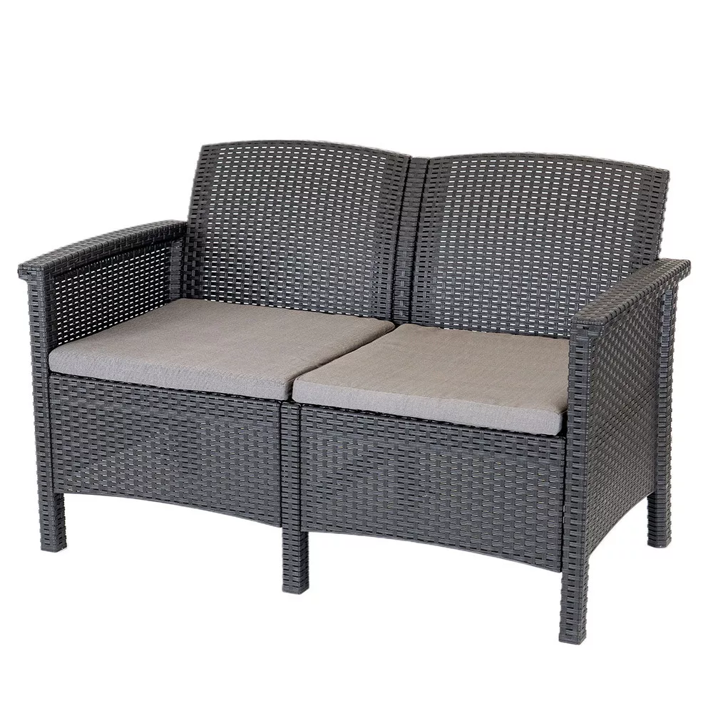 Sofa ogrodowa 2-osobowa Venus wykończona jest w stonowanym kolorze grafitowym. Poduszki na siedziska są o kilka odcieni jaśniejsze, co daje niepowtarzalny efekt i elegancję.