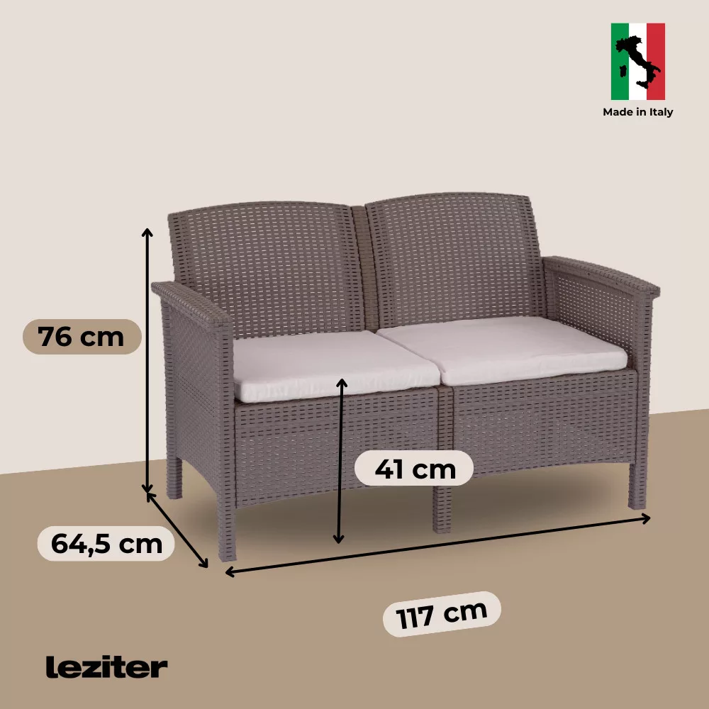 Ez az olasz gyártmányú, barna színű, kényelmes és elegáns bútor szett két 63 x 64,5 x 76 cm-es fotelt, egy 117 x 64,5 x 76 cm-es két személyes kanapét, egy 172 x 64,5 x 76 cm-es három személyes kanapét és egy 60 x 54,5 x 40,5 cm-es négyszögletes asztalt foglal magába. Ez a 7 személyes kerti bútor szett rendkívül előnyös lehet, ha szeretnéd kiélvezni a szabadban eltöltött időt barátaiddal vagy családoddal.
