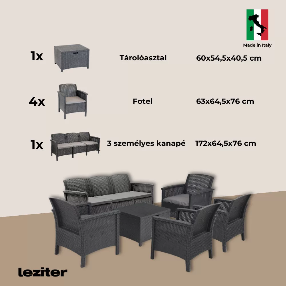 Wykonany we Włoszech w kolorze grafitowym, ten wygodny i stylowy zestaw mebli obejmuje cztery krzesła o wymiarach 63 x 64,5 x 76 cm, jedną trzyosobową sofę o wymiarach 172 x 64,5 x 76 cm i jeden prostokątny niski stolik o wymiarach 60 x 54,5 x 40,5 cm. Jest to zestaw, który można zaaranżować w dowolnej przestrzeni, aby wygodnie pomieścić towarzystwo.