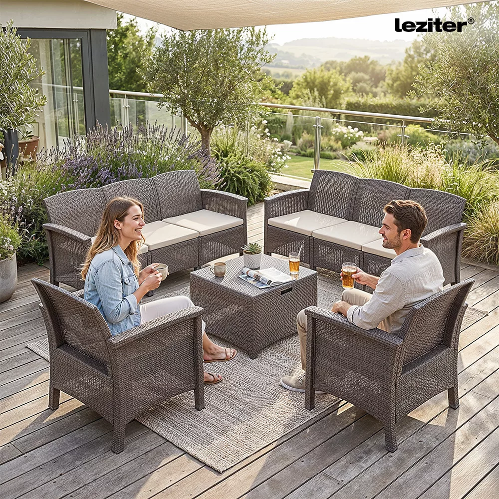 A Venus Large 8 személyes kerti bútor garnitúra ideális megoldás nagyobb családok és baráti társaságok számára. A két három személyes kanapé és a két fotel nappali hangulatú ülőteret biztosít kertben vagy teraszon. A kompakt, négyszögletes asztal praktikus kiegészítőként szolgál beszélgetésekhez vagy pihenéshez. A cappuccino szín elegáns és időtálló megjelenést kölcsönöz a kültéri térnek.