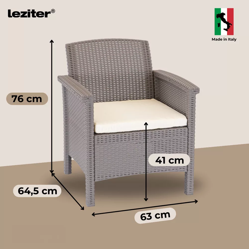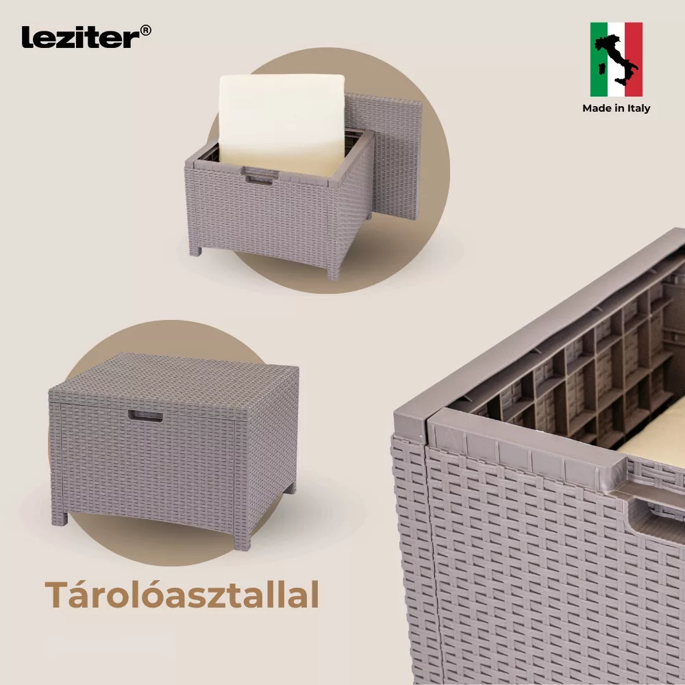Az UV-álló műanyag rattan szerkezet ellenáll az időjárás viszontagságainak, így a bútor hosszú távon is megőrzi minőségét. A karbantartásmentes kialakítás egész éves használatot tesz lehetővé. A felület vízzel vagy enyhe tisztítószerrel egyszerűen tisztítható, az ülőpárnák pedig moshatók, így a mindennapi használat során is praktikus választás.