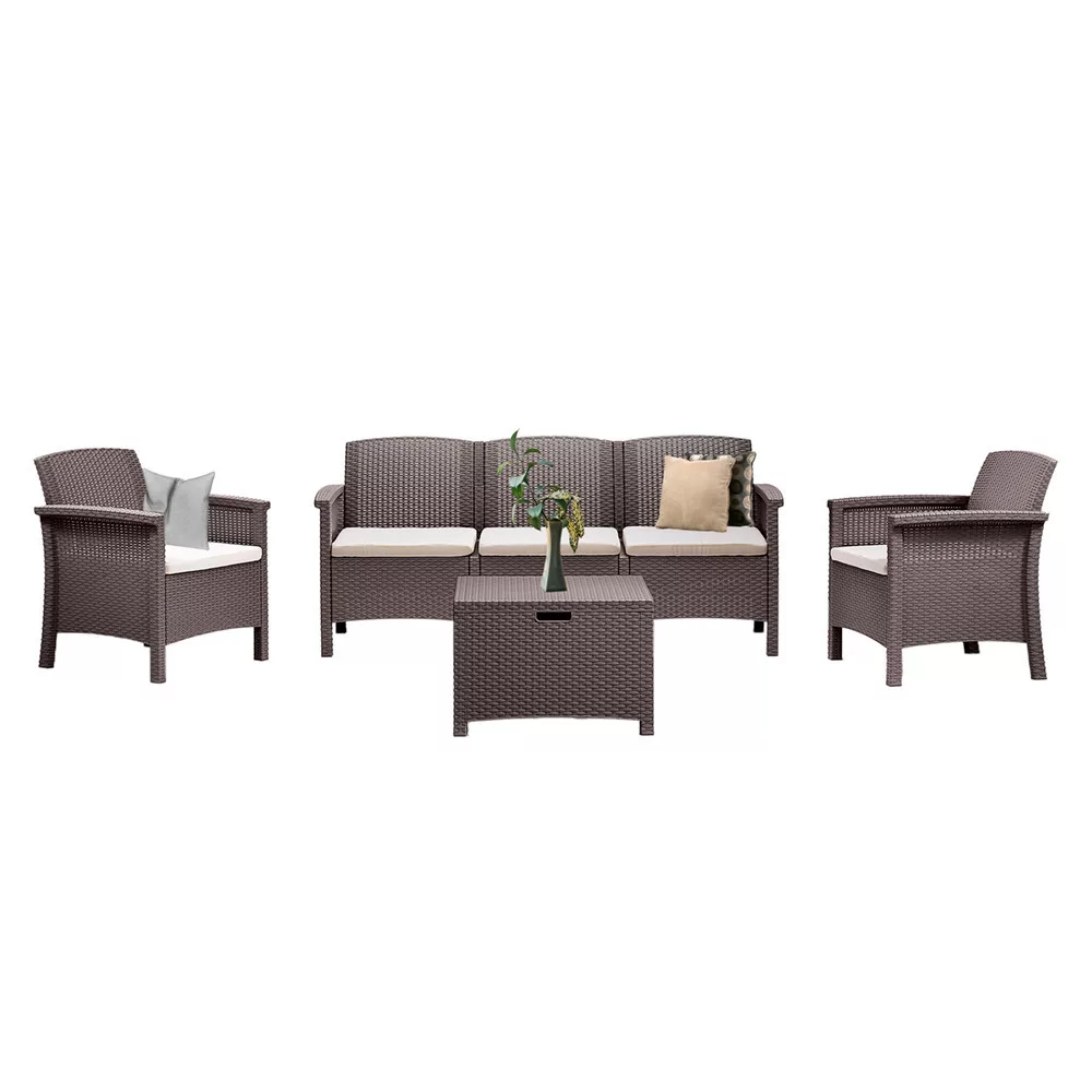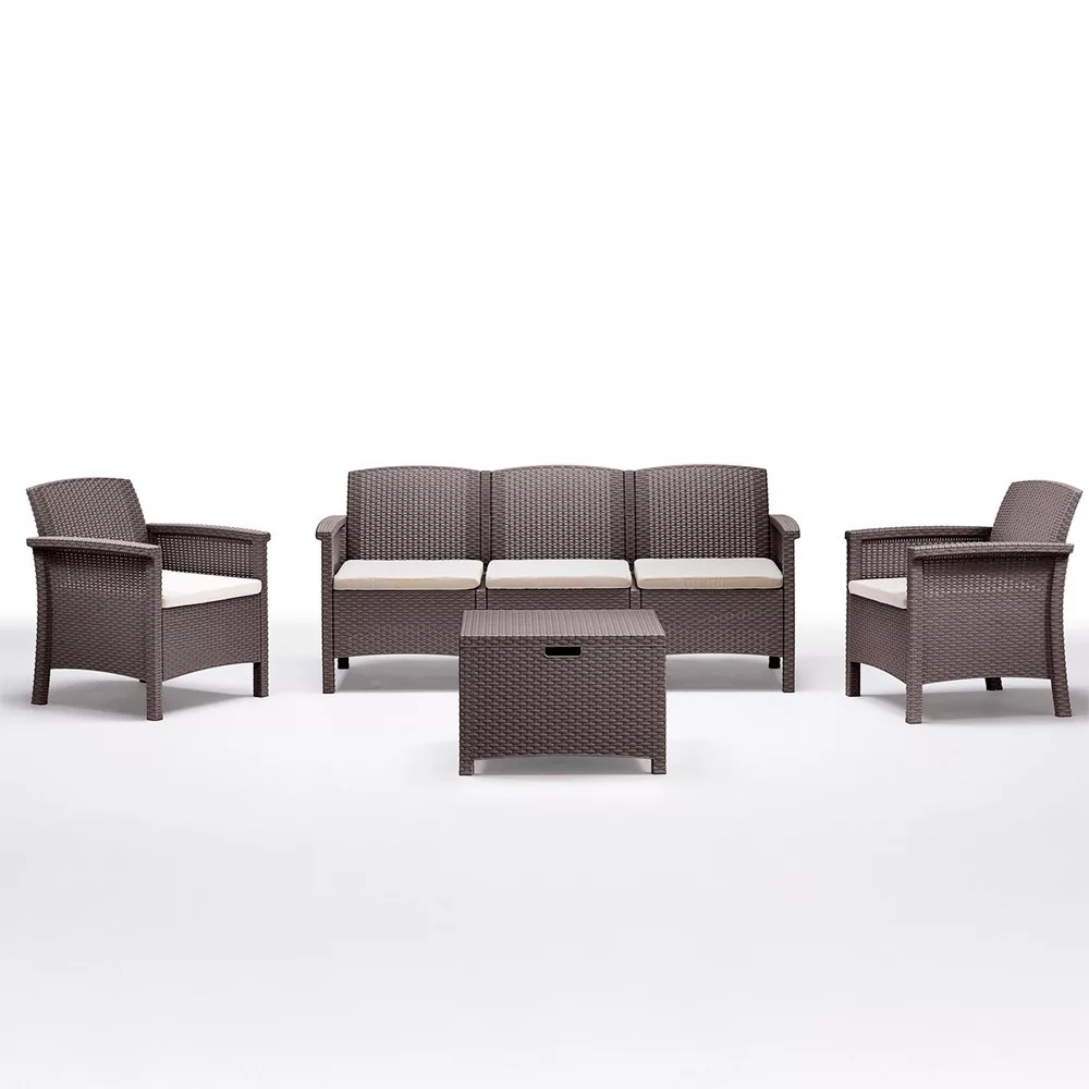 Zestaw mebli ogrodowych Venus ma wszystkie cechy, których potrzebujesz: jest odporny na warunki atmosferyczne, wygodny, estetyczny i nie wymaga konserwacji. Wykończenie z efektem rattanu emanuje nowoczesną elegancją, a wyściełane siedziska zapewniają wiele godzin komfortu.