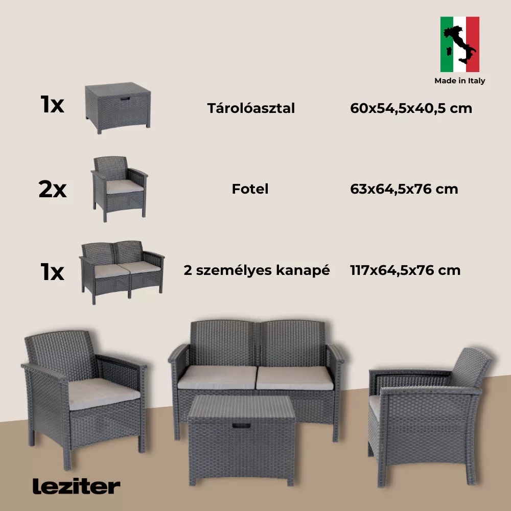 Wysokiej jakości konstrukcja, wykonana we Włoszech, oznacza w praktyce wysoką niezawodność i że meble będą miały długą żywotność bez wyjątku. Zestaw jest również odporny na uszkodzenia i długotrwałe działanie czynników atmosferycznych i promieniowania UV, a kolor pozostaje trwały. Ze względu na swoją trwałość polecamy go do restauracji i kawiarni, ewentualnie hoteli, gdyż bardzo dobrze znosi codzienne użytkowanie.