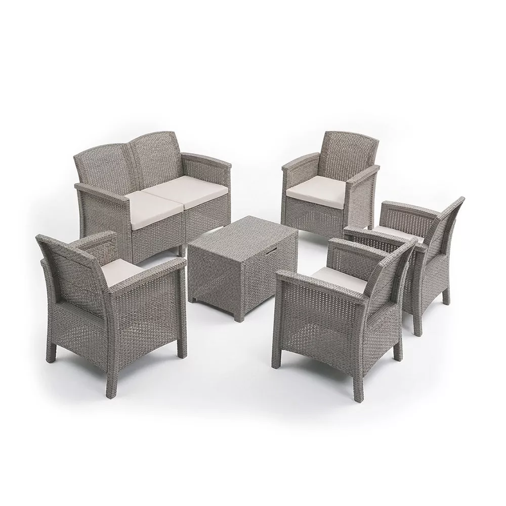 A Venus II Big 6 személyes kerti bútor garnitúra ideális választás közepes méretű családok és baráti társaságok számára. A négy fotel és a két személyes kanapé együttese kényelmes, jól variálható ülőhelyet biztosít kertben, teraszon vagy erkélyen. A cappuccino szín elegáns, meleg hangulatot teremt, míg a rattan hatású felület természetes megjelenést biztosít.