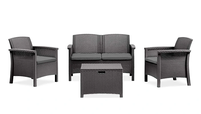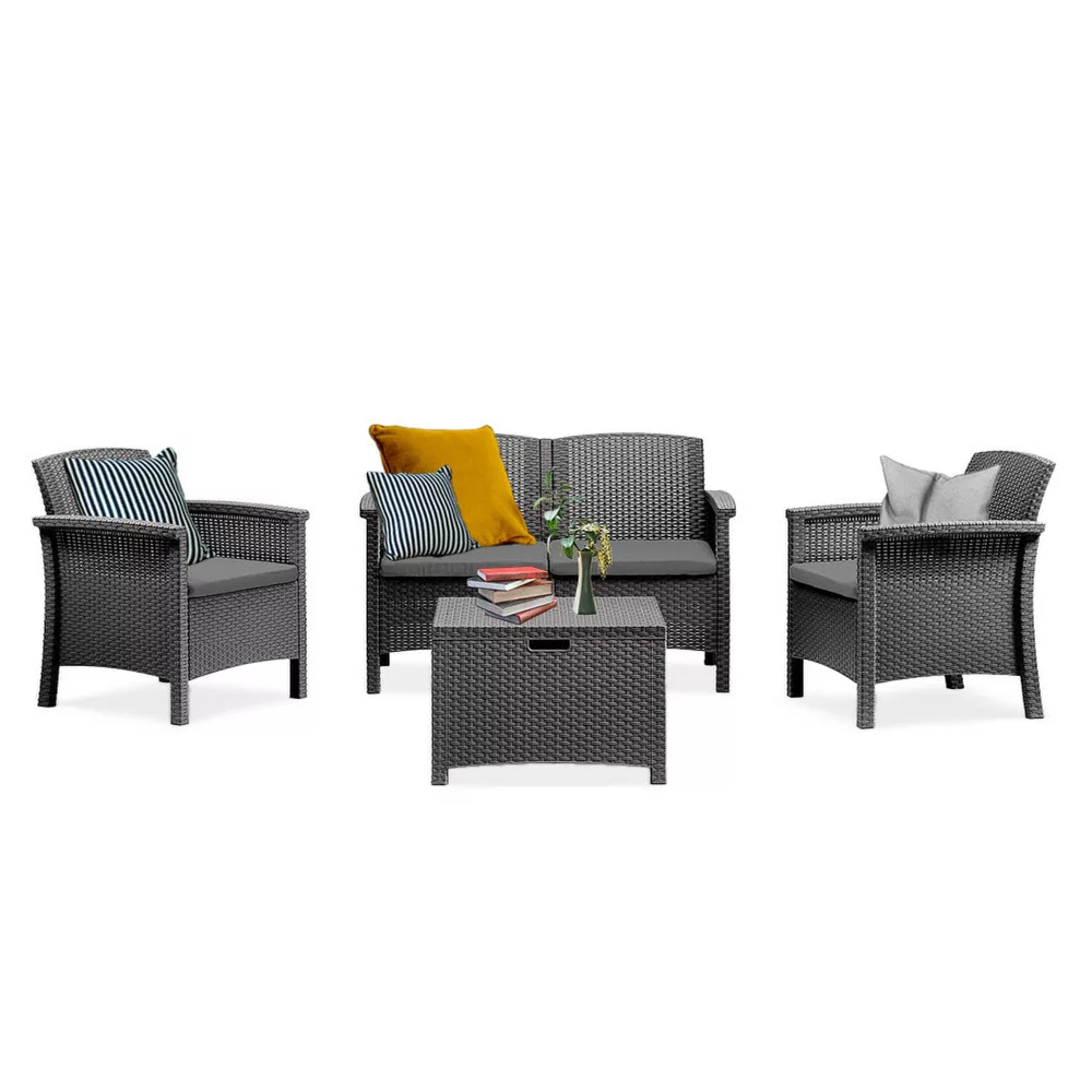 Dostępny w kolorze grafitowym ze stylowymi poduszkami, zestaw mebli ogrodowych posiada lekką, ale wytrzymałą ramę, dzięki czemu jest łatwy do przenoszenia, a jednocześnie solidny. Nie wymaga konserwacji, co oznacza, że nie ma potrzeby ciągłej pielęgnacji mebli, przykrycia lub ochrony przed warunkami atmosferycznymi. Wszystkie elementy są łatwe w czyszczeniu, dzięki czemu możesz cieszyć się nieskazitelnym wykończeniem w mgnieniu oka.