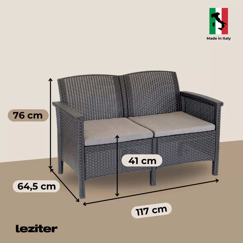 Wyprodukowany we Włoszech rattanowy zestaw mebli ogrodowych Venus 4 seater w kolorze grafitowym to praktyczny i stylowy wybór zarówno do użytku zewnętrznego, jak i wewnętrznego. Zestaw mebli obejmuje dwa wygodne fotele o wymiarach 63 x 64,5 x 76 cm, 2-osobową sofę o wymiarach 117 x 64,5 x 76 cm i prostokątny stół o wymiarach 60 x 54,5 x 40,5 cm, zapewniając idealne miejsce do rozmów na świeżym powietrzu, przekąsek lub relaksu z przyjaciółmi i rodziną.