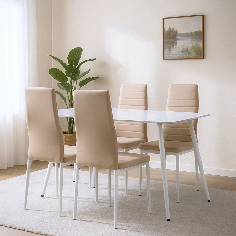 Kontrastująca beżowo-szarakolorystyka elegancko oprawia nastrój przestrzeni, a łatwe do czyszczenia, wytrzymałe powierzchnie sprawiają, że jest to naprawdę praktyczny wybór zarówno na pracowite dni powszednie, jak i na specjalne okazje. Zestaw to doskonały wybór dla małych rodzin lub par, które cenią ponadczasowe materiały i nowoczesny design.