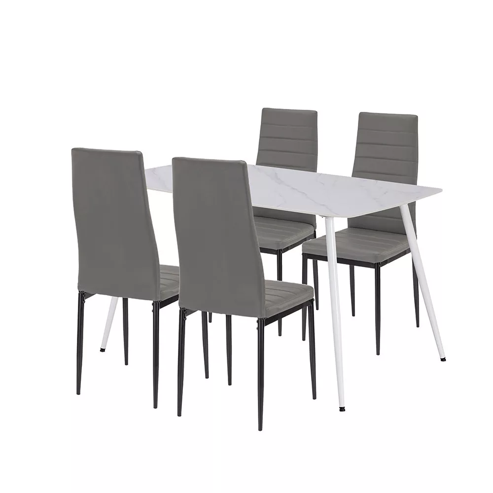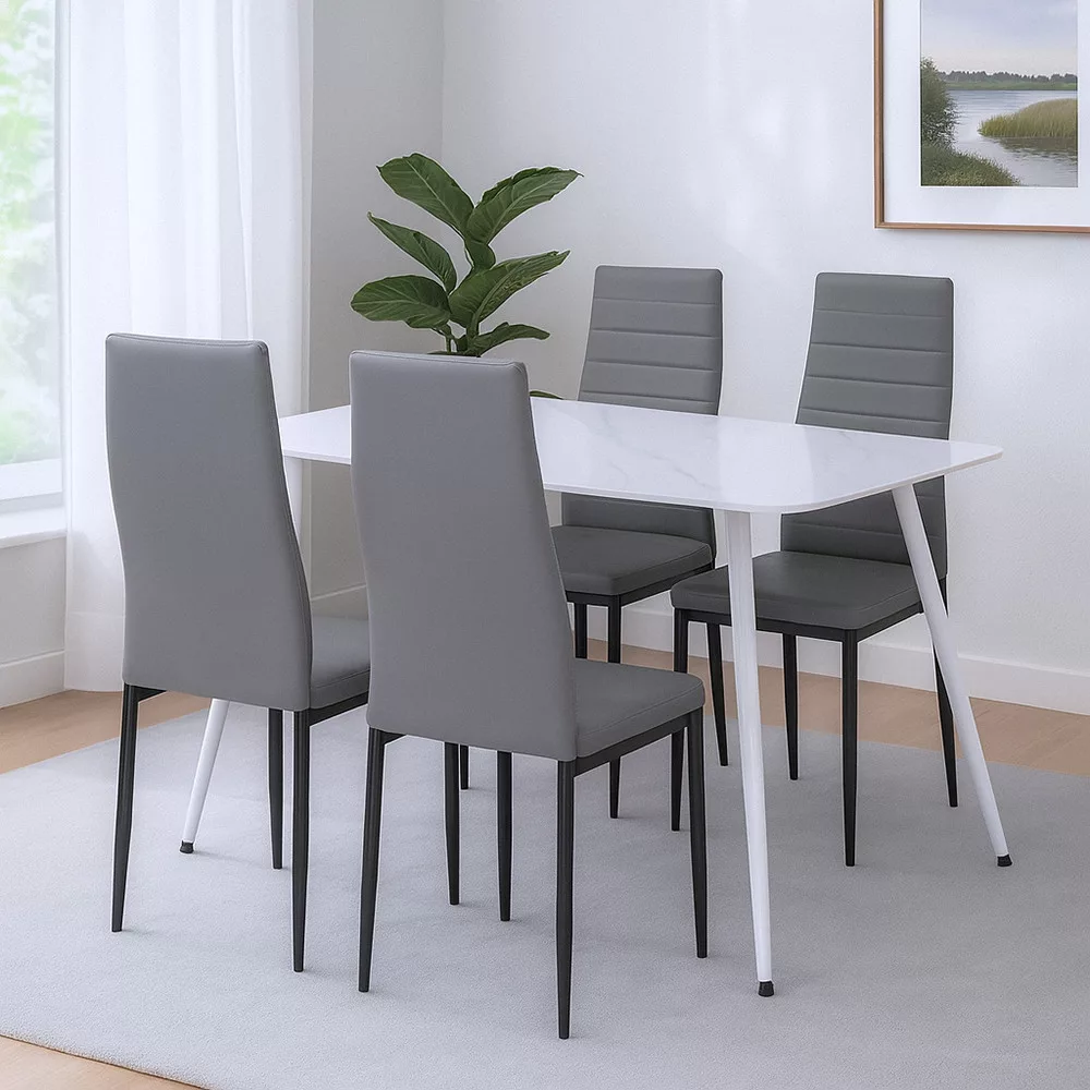 Kontrastująca szaro-czarna kolorystyka elegancko podkreśla nastrój przestrzeni, a łatwe do czyszczenia, wytrzymałe powierzchnie sprawiają, że jest to naprawdę praktyczny wybór zarówno na pracowite dni powszednie, jak i na specjalne okazje. Zestaw jest idealnym wyborem dla małych rodzin lub par, które cenią sobie ponadczasowe materiały i nowoczesny design.