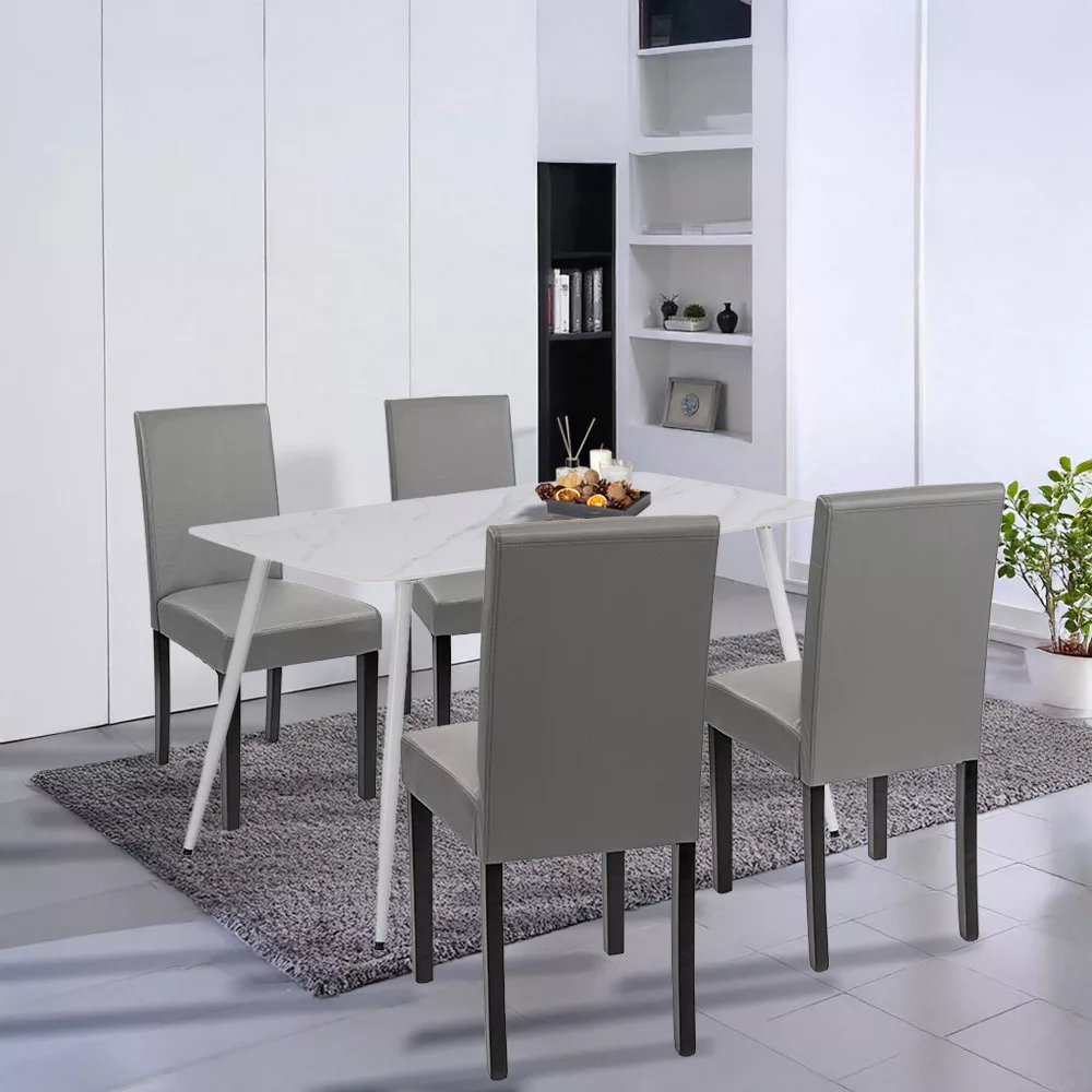 Zestaw zawiera cztery krzesła Leziter Kelly, które są nie tylko stylowe dzięki szarej tapicerce ze skóry ekologicznej, ale także niezwykle łatwe w czyszczeniu. Grube siedzisko z pianki o grubości 4 cm zapewnia komfort nawet podczas długich kolacji, a solidne sosnowe nogi o nośności 120 kg pozostają niezawodnymi towarzyszami nawet podczas intensywnego użytkowania.