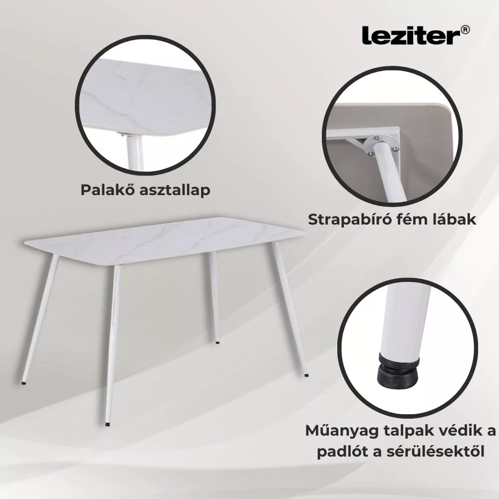Dzięki białemu kolorowi i czystemu, nowoczesnemu wzornictwu, stół do jadalni Leziter Bora tworzy wyrafinowaną atmosferę w Twoim pokoju. Jego rozmiar (140x80x75 cm) sprawia, że idealnie nadaje się do średnich i dużych przestrzeni, zapewniając wygodne miejsce do siedzenia dla 4-6 osób. Blat stołu wykonany jest ze spiekanego kamienia, który jest wysoce odporny na zarysowania, plamy i ciepło dzięki swojej naturalnej fakturze i wysokiej jakości technologii produkcji. Malowane na biało metalowe nogi zapewniają dodatkową stabilność, a plastikowe stopki chronią podłogę. Płytka konstrukcja sprawia, że montaż jest szybki i łatwy, dzięki czemu można szybko cieszyć się elegancją i komfortem nowej jadalni.