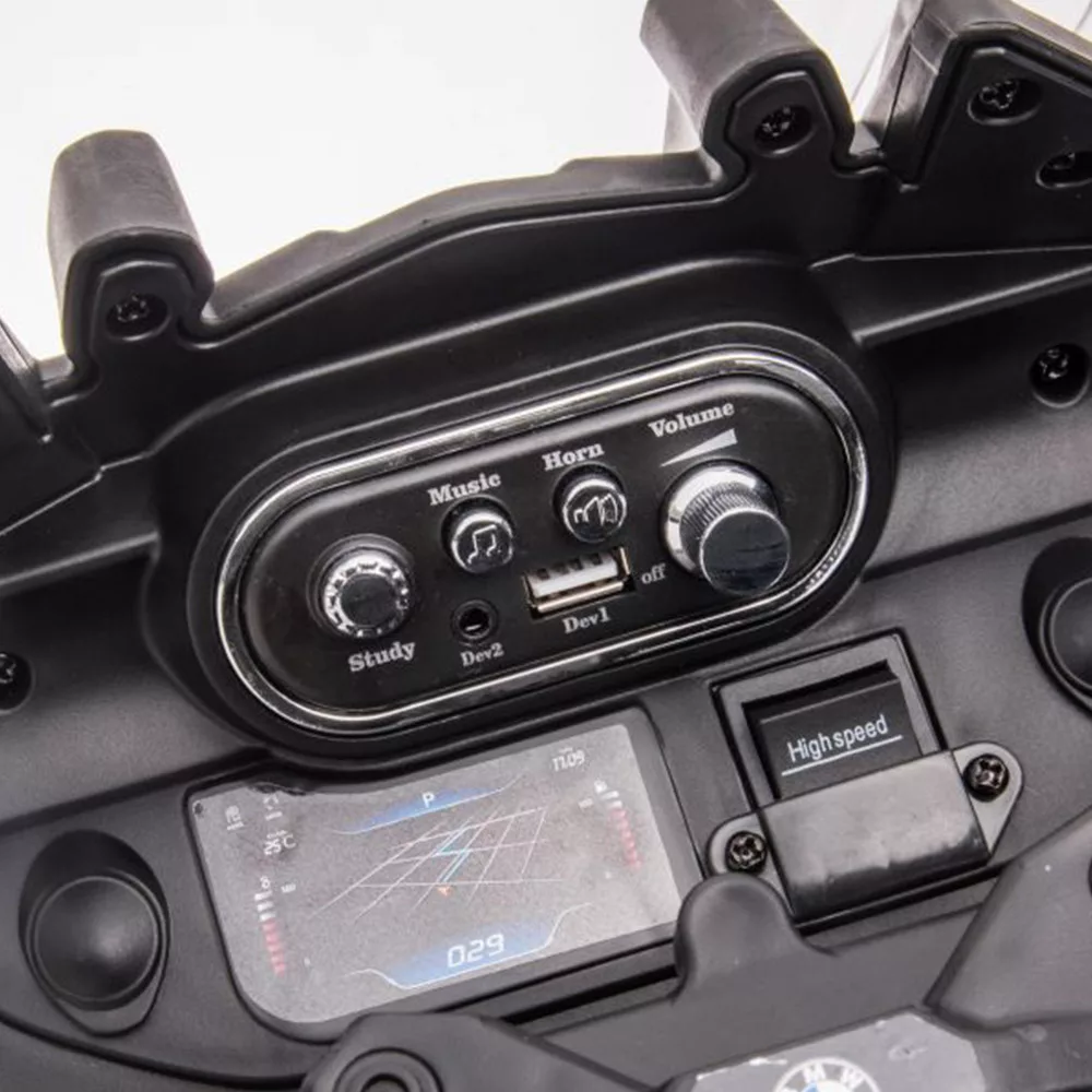 Nowoczesna wygoda i kontrola: mały motocykl oferuje łączność USB i MP3, dzięki czemu dzieci mogą odtwarzać własną muzykę. Wskaźnik naładowania baterii na wyświetlaczu pomaga kontrolować czas pracy, a głośniki mają regulowaną głośność.