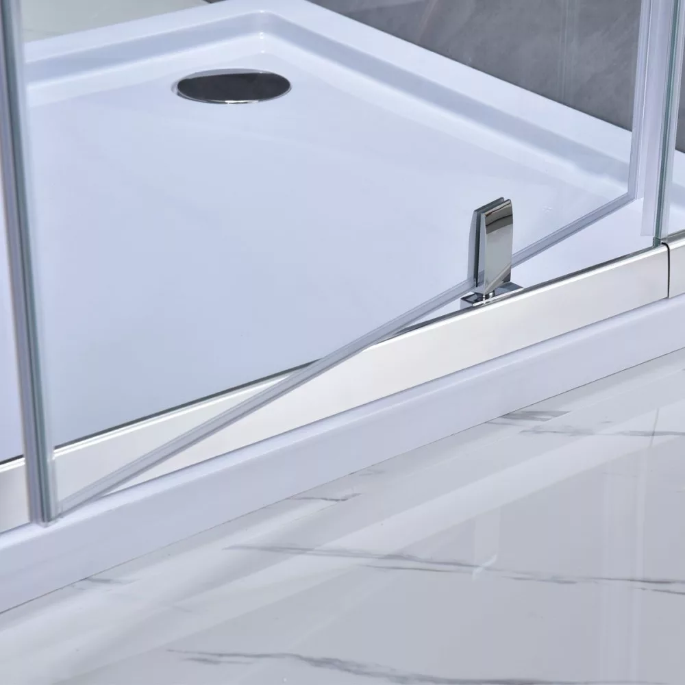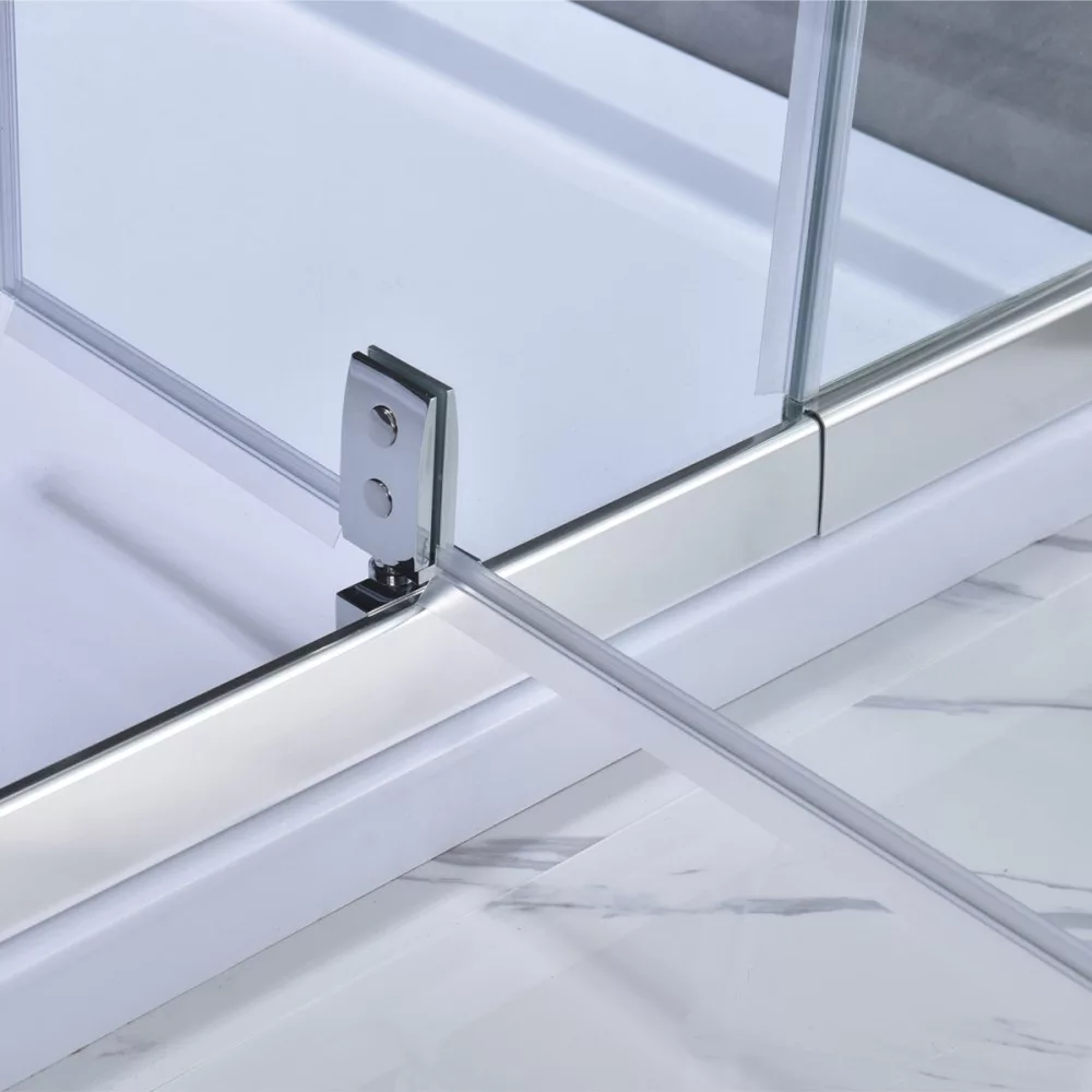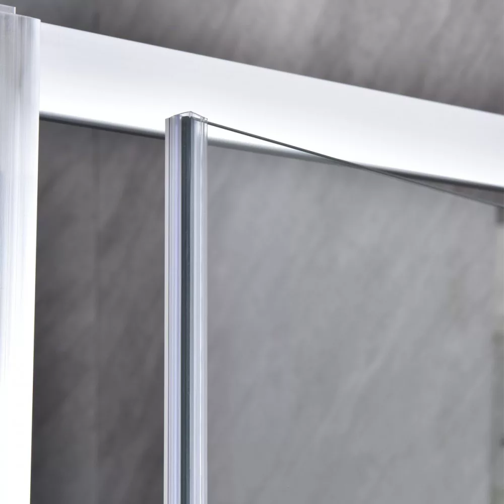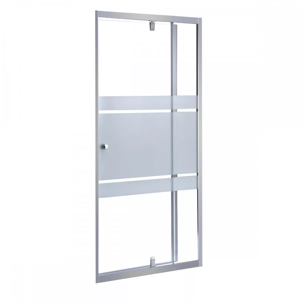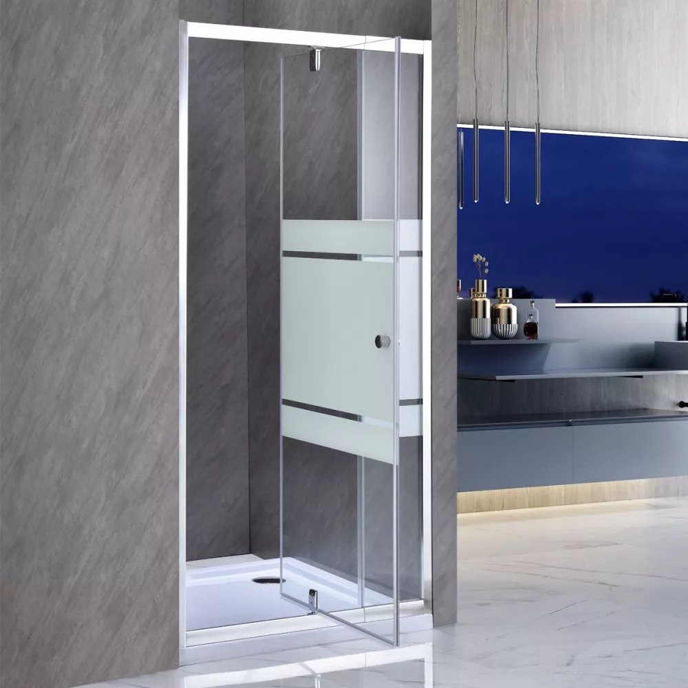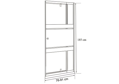 Drzwi prysznicowe z chromowaną aluminiową ramą i 6 mm przezroczystym hartowanym szkłem bezpiecznym. Model ma szerokość 76-91 cm i wysokość 185 cm.