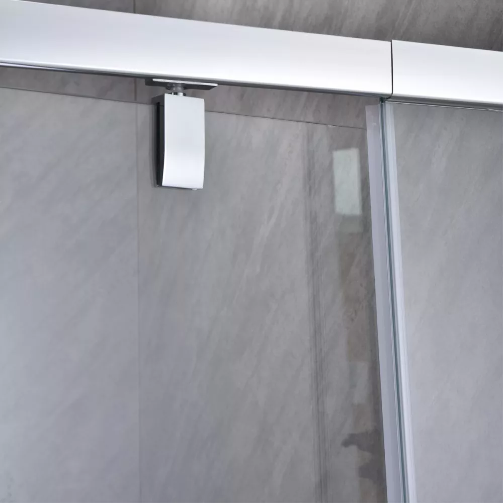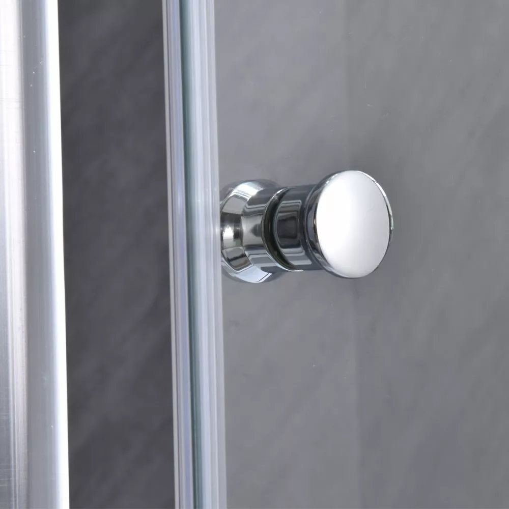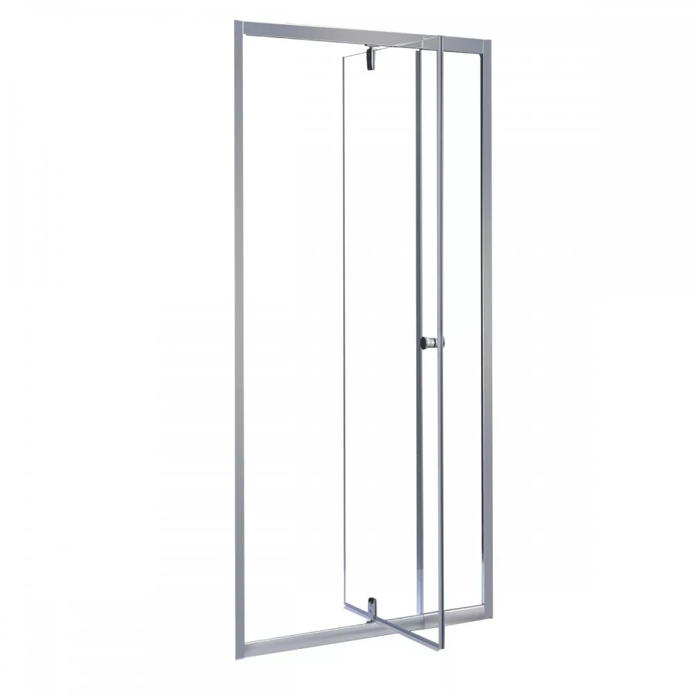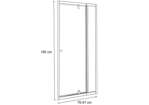 Samozamykające się drzwi prysznicowe o regulowanej szerokości 76-91 cm, z przezroczystym szkłem bezpiecznym 6 mm, chromowanymi podwójnymi profilami aluminiowymi i uchwytem drzwiowym.