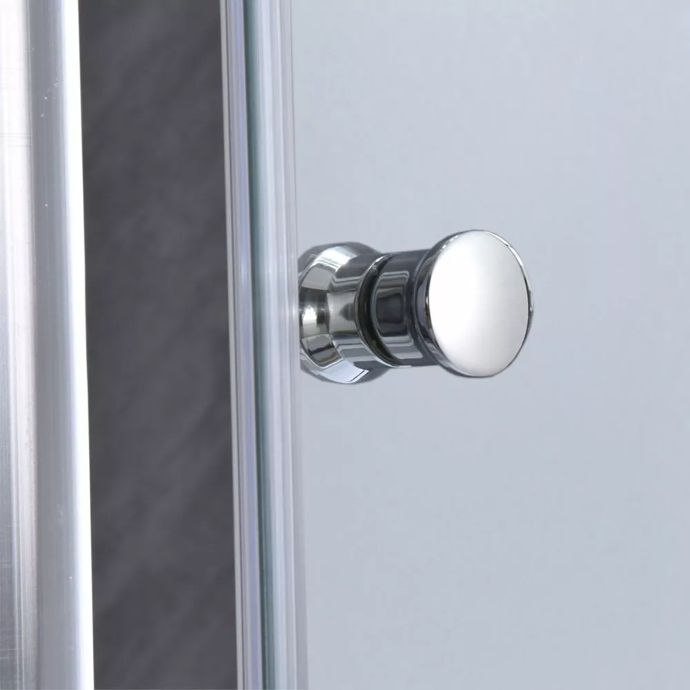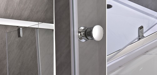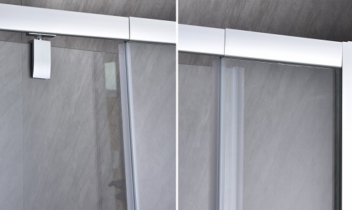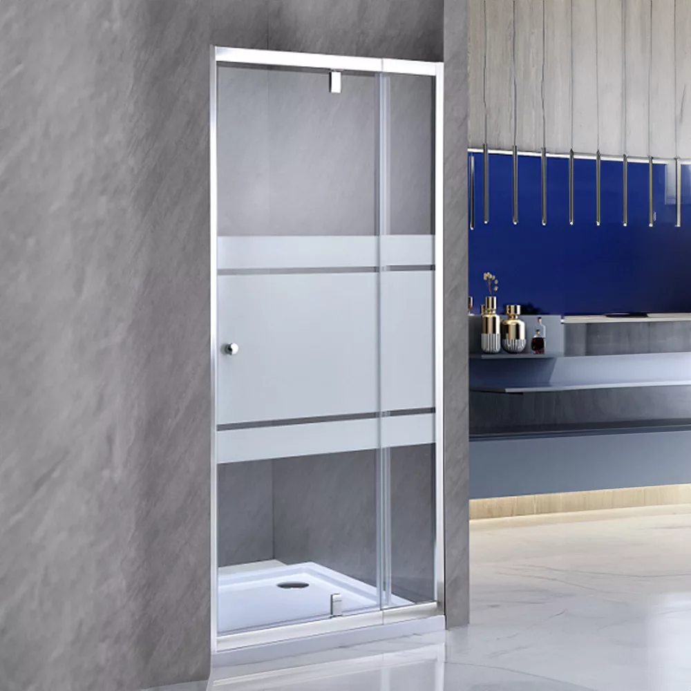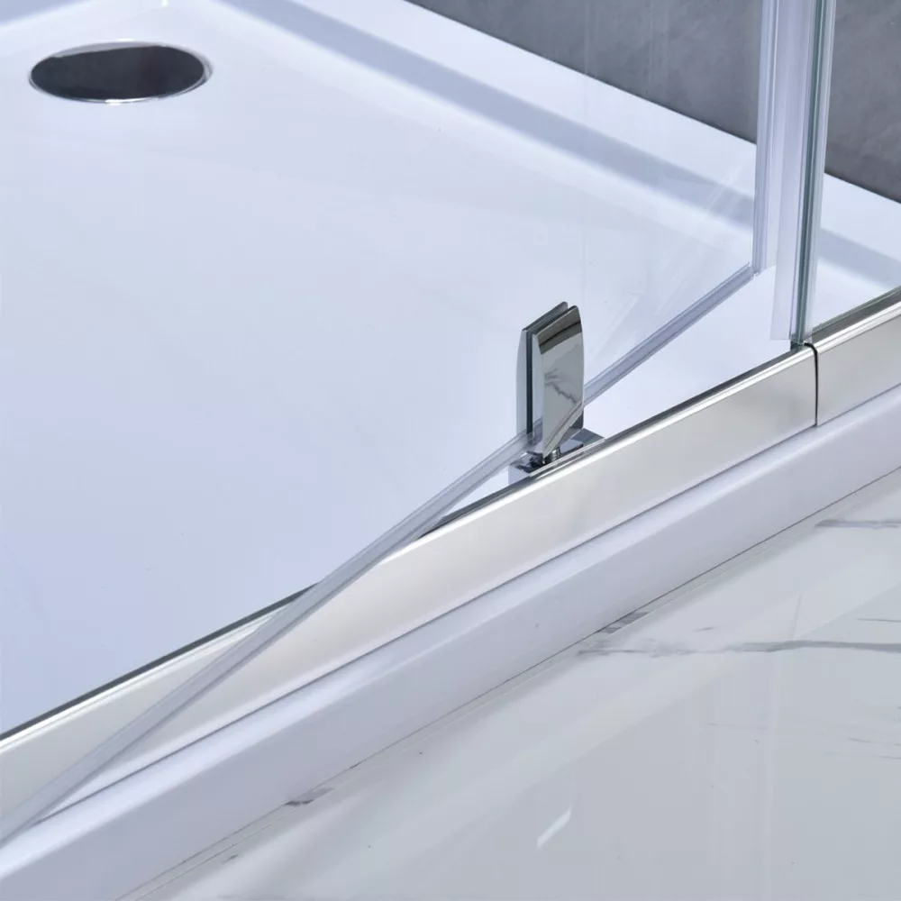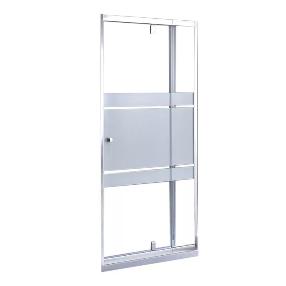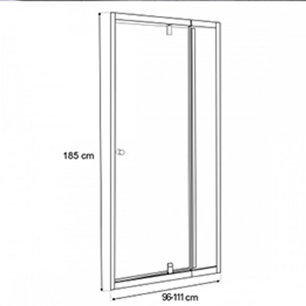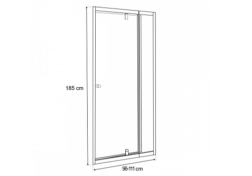 Samozamykające się drzwi prysznicowe o regulowanej szerokości od 96 do 111 cm, z przezroczystym szkłem o grubości 6 mm, chromowanymi profilami aluminiowymi i uchwytem.