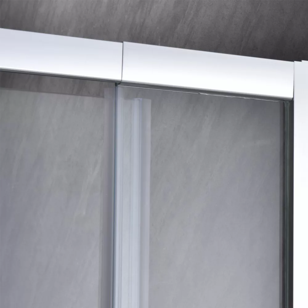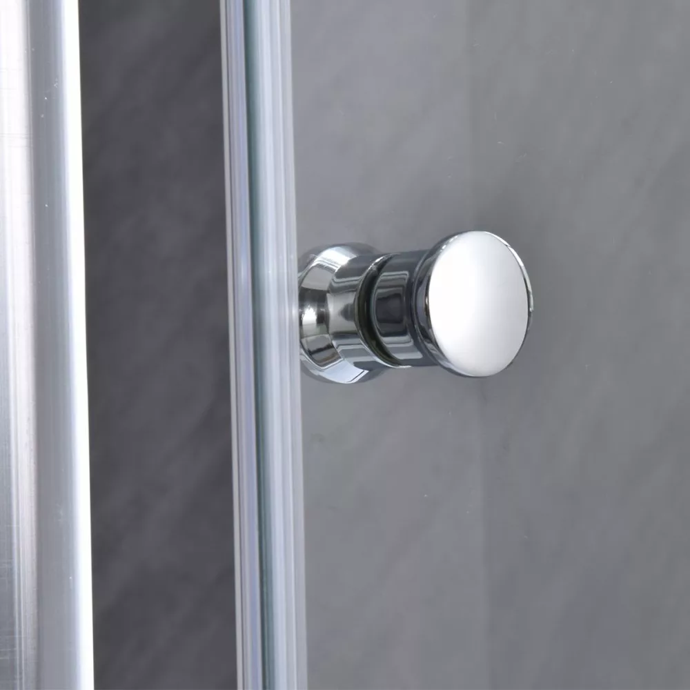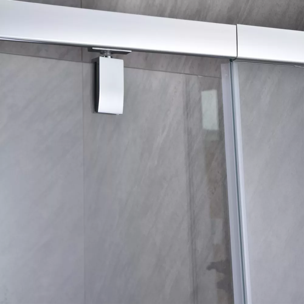Samozamykające się drzwi prysznicowe o regulowanej szerokości od 96 do 111 cm, z przezroczystym szkłem o grubości 6 mm, chromowanymi profilami aluminiowymi i uchwytem.