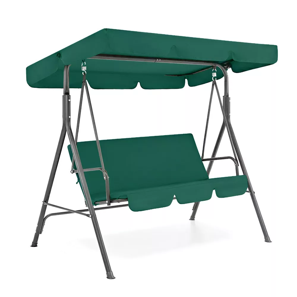 Poliestrowy baldachim nie tylko zapewnia ochronę przed szkodliwymi promieniami UV, ale także oferuje niewielkie schronienie podczas lżejszych opadów deszczu. Materiał jest odporny na blaknięcie pod wpływem światła słonecznego, dzięki czemu kolor huśtawki przez długi czas zachowa swój pierwotny zielony odcień.