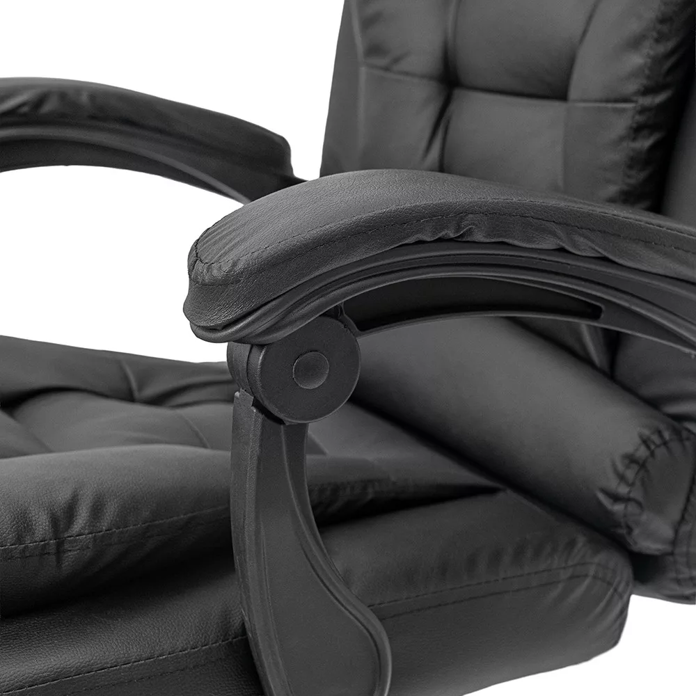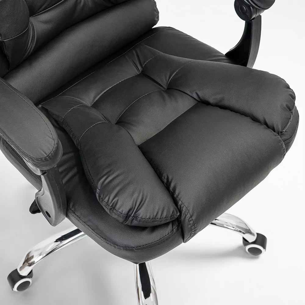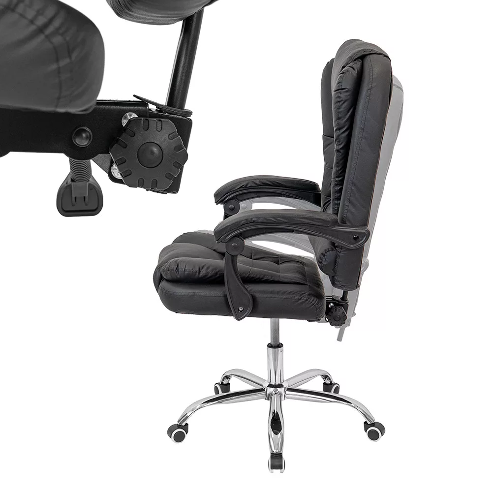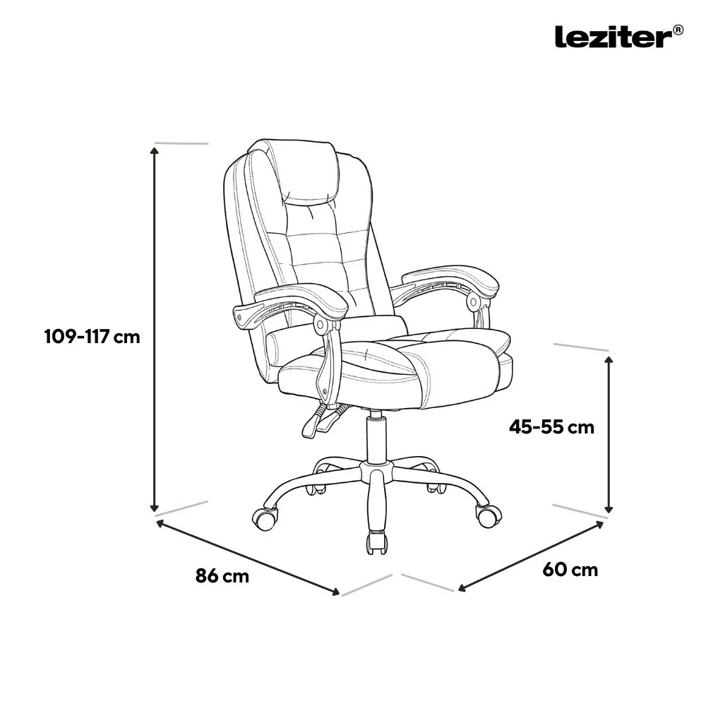 Krzesło biurowe obrotowe Optima czarneForma: biurowe krzesło obrotowe z wysokim oparciemSzerokość: 60 cmGłębokość: 86 cmWysokość siedziska: 49-55 cm (regulowana)Wysokość całkowita: 109-117 cm (regulowana)Materiał oparcia: skóra ekologiczna PUMateriał powierzchni siedziska: skóra ekologiczna PUMechanizm: odchylane oparcie, funkcja odchylaniaPodnośnik gazowy: klasa 2Podstawa: chromowana metalowa podstawa w kształcie gwiazdy, 32 cm odległości między kółkami a podnośnikiem gazowymKółka: 5kółekDźwignie: stałe, wyściełaneKolor: czarnyPrzeznaczenie: biuro, gabinet, biuro domoweObrotowe krzesło biurowe Optima do wygodnej codziennej pracyObrotowe krzesło biurowe Optima to klasycznie zaprojektowane krzesło obrotowe z wysokim oparciem do pracy siedzącej i ogólnego użytku biurowego. Wyściełane siedzisko i oparcie zapewniają odpowiednie wsparcie podczas codziennej pracy, a regulowana wysokość krzesła obrotowego pozwala na spersonalizowanie pozycji roboczej.Gazowy mechanizm podnoszenia ułatwia regulację wysokości siedziska, umożliwiając łatwe dostosowanie krzesła do różnych wysokości ciała i wysokości biurka. Mechanizm pochylania umożliwia także odchylenie fotela podczas krótkich przerw w pracy.Wygodna, amortyzowana konstrukcja dla dłuższych sesji siedzenia Oparcie i siedzisko biurowego fotela obrotowego Optima są pokryte skórą PU, co zapewnia jednolity wygląd i łatwą do czyszczenia powierzchnię. Gruba amortyzacja przyczynia się do wygodnego siedzenia nawet podczas długiej pracy. Zagłówek i szerokie oparcie zapewniają odpowiednie wsparcie dla górnej części pleców.Łatwa mobilność w środowisku biurowymObrotowe krzesło biurowe posiada chromowaną metalową podstawę w kształcie gwiazdy, która zapewnia stabilne podparcie podczas użytkowania. Pięć kółek umożliwia łatwe poruszanie się po różnych powierzchniach podłogowych, zarówno wykładzinie biurowej, jak i twardej podłodze. Stałe, wyściełane podłokietniki pomagają wygodnie podeprzeć ramiona podczas pracy.Dla kogo polecany jest biurowy fotel obrotowy Optima?Obrotowy fotel biurowy Leziter Optima to idealny wybór dla osób poszukujących klasycznie wyglądającego, wygodnego i regulowanego krzesła biurowego do codziennej pracy. Polecany jest do biur, biur domowych i gabinetów, w których ważna jest solidna konstrukcja, amortyzowana konstrukcja i łatwa do czyszczenia powierzchnia.