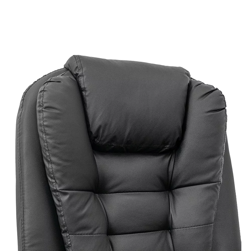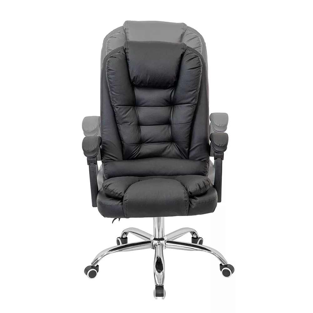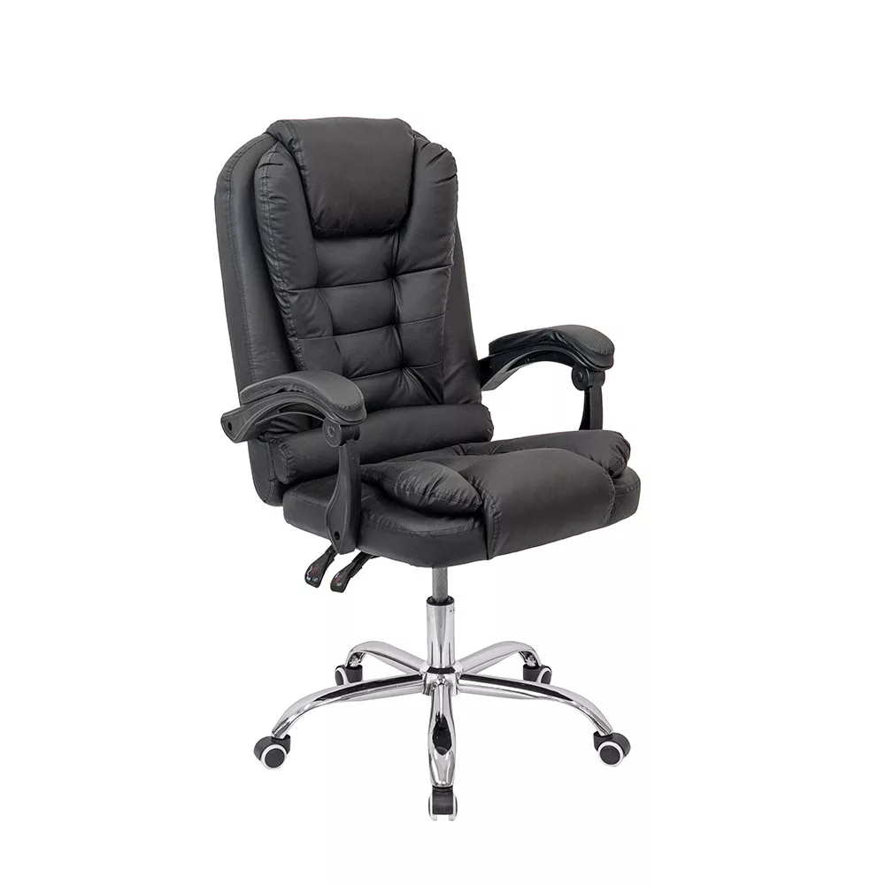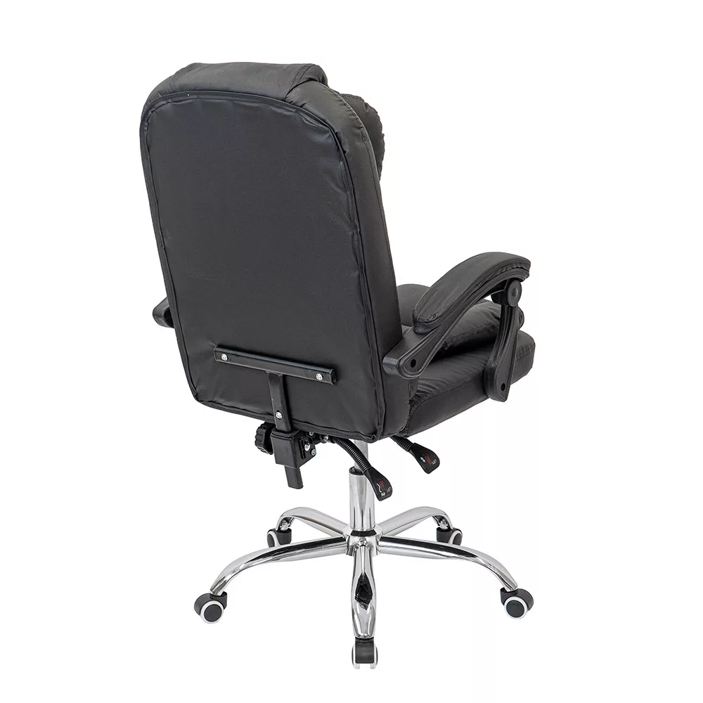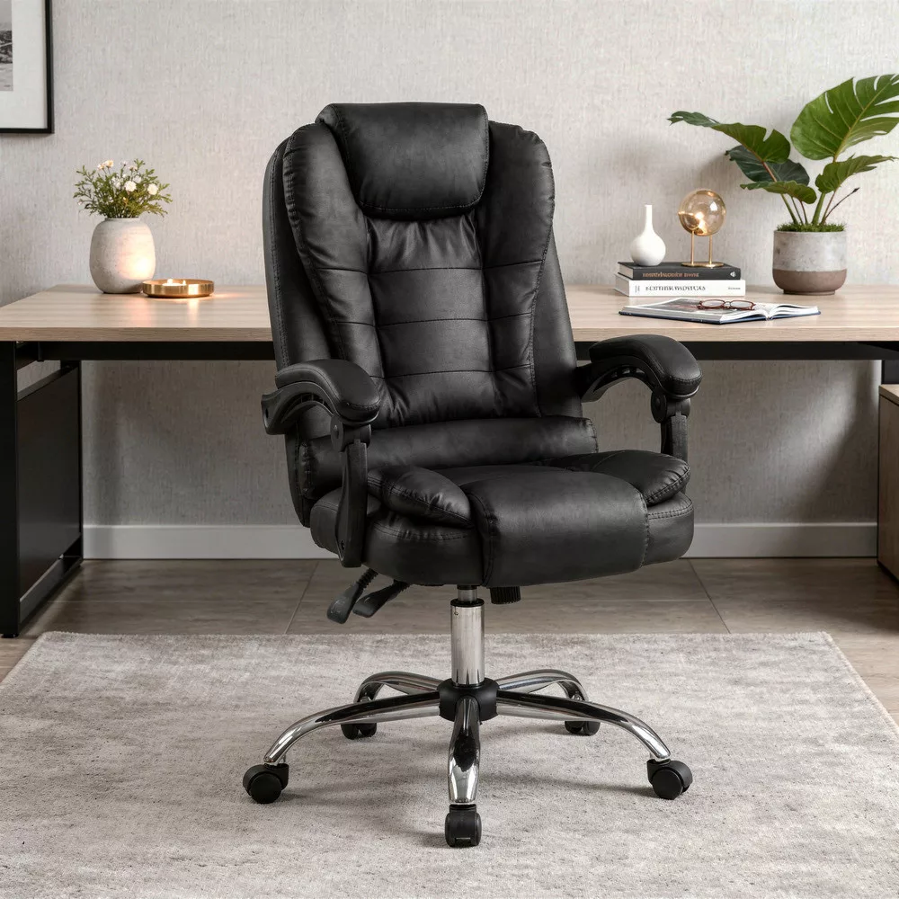 Krzesło biurowe obrotowe Optima czarneForma: biurowe krzesło obrotowe z wysokim oparciemSzerokość: 60 cmGłębokość: 86 cmWysokość siedziska: 49-55 cm (regulowana)Wysokość całkowita: 109-117 cm (regulowana)Materiał oparcia: skóra ekologiczna PUMateriał powierzchni siedziska: skóra ekologiczna PUMechanizm: odchylane oparcie, funkcja odchylaniaPodnośnik gazowy: klasa 2Podstawa: chromowana metalowa podstawa w kształcie gwiazdy, 32 cm odległości między kółkami a podnośnikiem gazowymKółka: 5kółekDźwignie: stałe, wyściełaneKolor: czarnyPrzeznaczenie: biuro, gabinet, biuro domoweObrotowe krzesło biurowe Optima do wygodnej codziennej pracyObrotowe krzesło biurowe Optima to klasycznie zaprojektowane krzesło obrotowe z wysokim oparciem do pracy siedzącej i ogólnego użytku biurowego. Wyściełane siedzisko i oparcie zapewniają odpowiednie wsparcie podczas codziennej pracy, a regulowana wysokość krzesła obrotowego pozwala na spersonalizowanie pozycji roboczej.Gazowy mechanizm podnoszenia ułatwia regulację wysokości siedziska, umożliwiając łatwe dostosowanie krzesła do różnych wysokości ciała i wysokości biurka. Mechanizm pochylania umożliwia także odchylenie fotela podczas krótkich przerw w pracy.Wygodna, amortyzowana konstrukcja dla dłuższych sesji siedzenia Oparcie i siedzisko biurowego fotela obrotowego Optima są pokryte skórą PU, co zapewnia jednolity wygląd i łatwą do czyszczenia powierzchnię. Gruba amortyzacja przyczynia się do wygodnego siedzenia nawet podczas długiej pracy. Zagłówek i szerokie oparcie zapewniają odpowiednie wsparcie dla górnej części pleców.Łatwa mobilność w środowisku biurowymObrotowe krzesło biurowe posiada chromowaną metalową podstawę w kształcie gwiazdy, która zapewnia stabilne podparcie podczas użytkowania. Pięć kółek umożliwia łatwe poruszanie się po różnych powierzchniach podłogowych, zarówno wykładzinie biurowej, jak i twardej podłodze. Stałe, wyściełane podłokietniki pomagają wygodnie podeprzeć ramiona podczas pracy.Dla kogo polecany jest biurowy fotel obrotowy Optima?Obrotowy fotel biurowy Leziter Optima to idealny wybór dla osób poszukujących klasycznie wyglądającego, wygodnego i regulowanego krzesła biurowego do codziennej pracy. Polecany jest do biur, biur domowych i gabinetów, w których ważna jest solidna konstrukcja, amortyzowana konstrukcja i łatwa do czyszczenia powierzchnia.