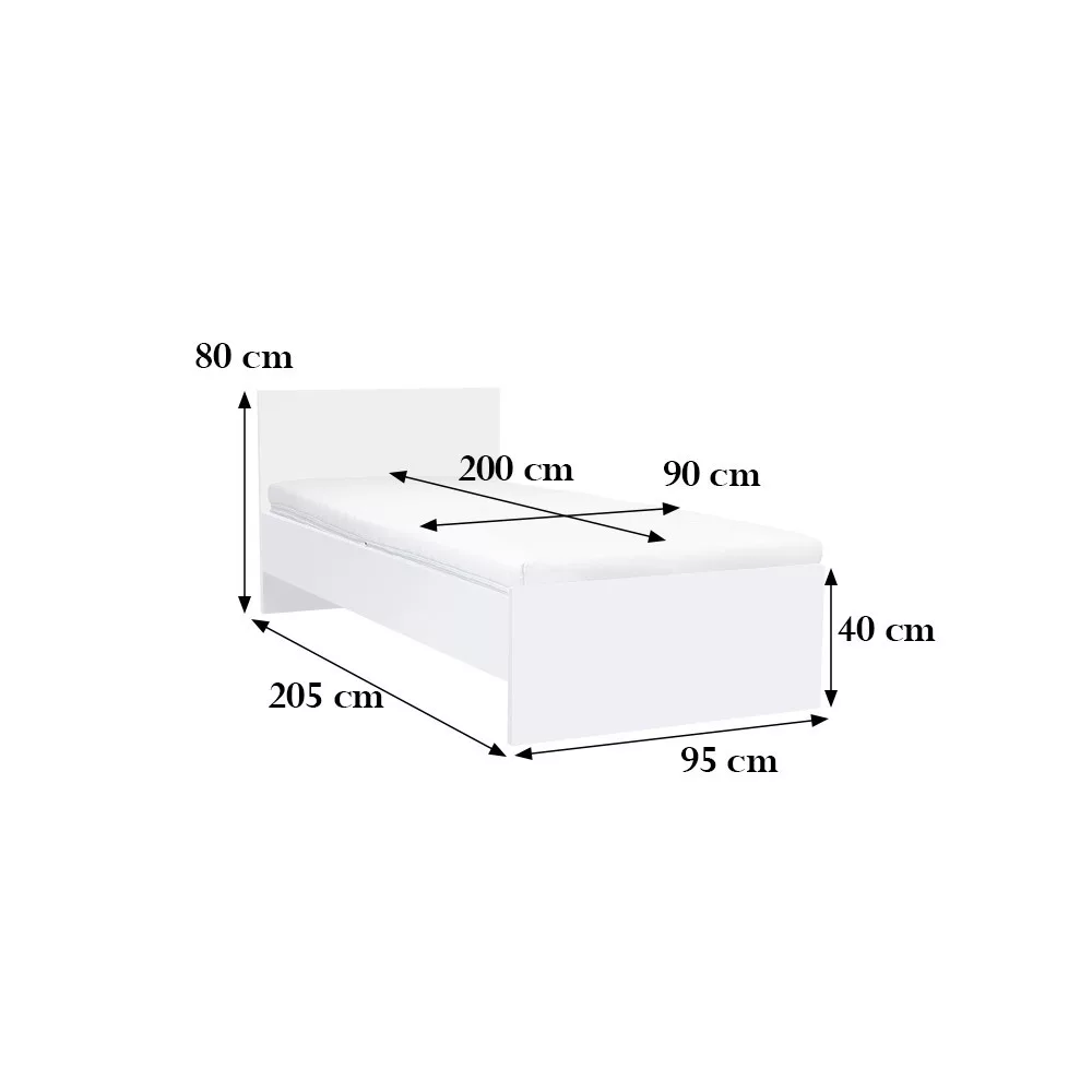 Rama łóżka: 205 x 95 cm, Oparcie łóżka: 80 x 95 cm, Materac (zalecany rozmiar): 200 x 90 cm. |