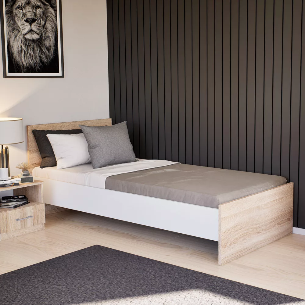 Wysokiej jakości płyta meblowa z białym panelem bocznym, wezgłowiem w kolorze dąb sonoma i zakończeniem łóżka. |