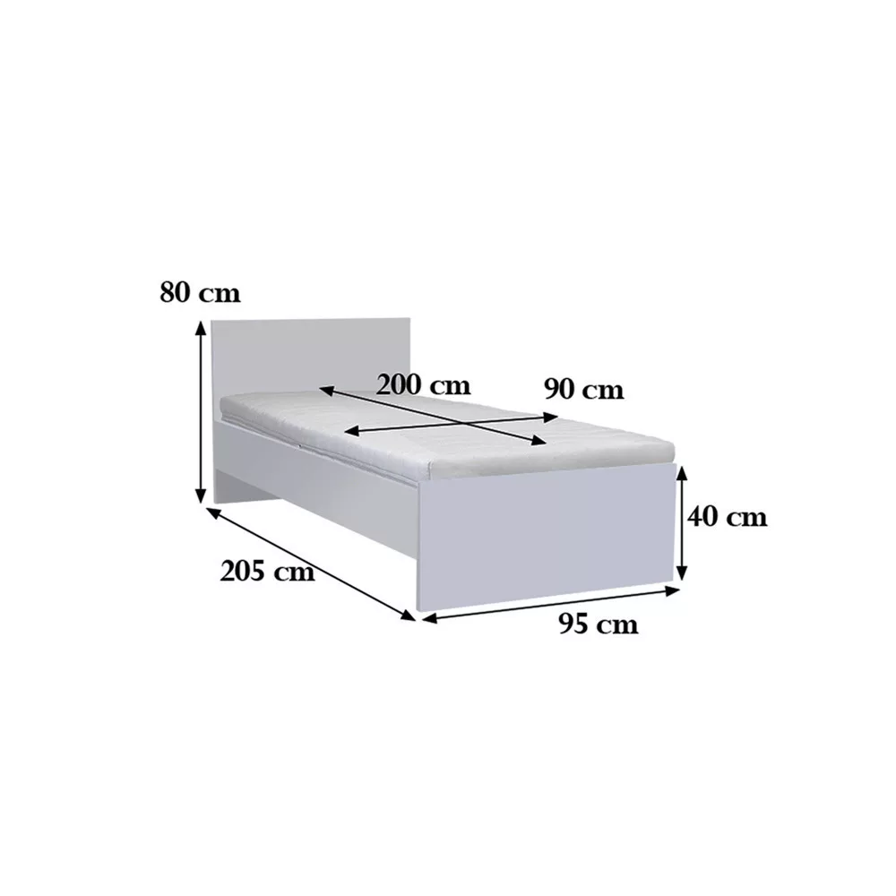 Rama łóżka: 205 x 95 cm, Oparcie łóżka: 80 x 95 cm, Materac (zalecany rozmiar): 200 x 90 cm. |