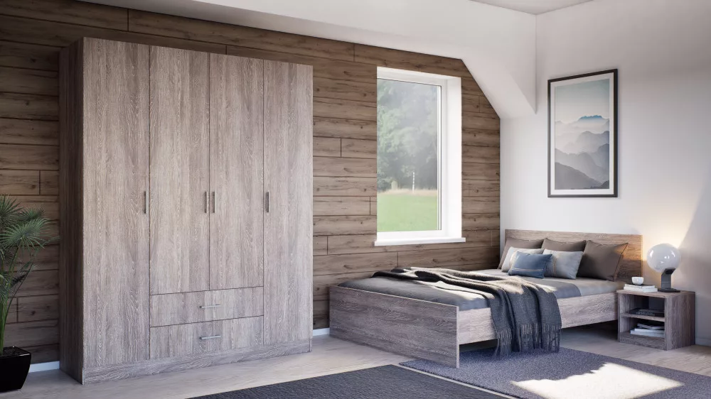 Korpus z dębu york i front z dębu york zapewniają czysty, świeży wygląd, a matowy chromowany uchwyt z tworzywa sztucznego nadaje nowoczesny wygląd. Minimalistyczny design tej szafki nocnej sprawia, że jest ona idealnym wyborem dla osób preferujących czyste linie.