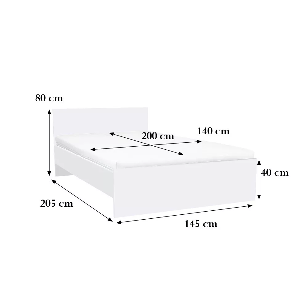 Rama łóżka: 205 x 145 cm, Oparcie łóżka: 80 x 145 cm, Materac (zalecany rozmiar): 200 x 140 cm. |