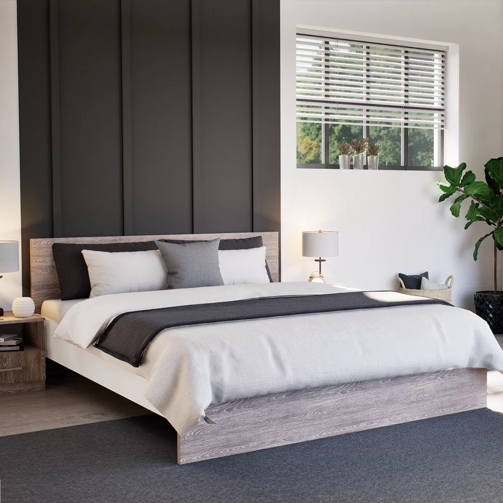 Wysokiej jakości płyta meblowa z białym panelem bocznym, zagłówkiem z dębu york i zakończeniem łóżka. |