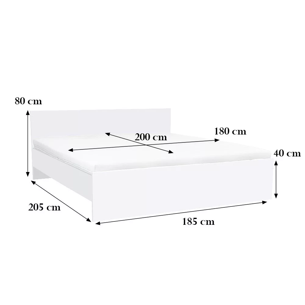 Łóżko Miami wykonane jest z wysokiej jakości płyty meblowej, z białymi panelami bocznymi, białym wezgłowiem i zakończeniem łóżka. Rama łóżka ma wymiary 205 x 165 cm. Wymiary ramy łóżka: 80 x 185 cm. Wymiary materaca pasującego do ramy łóżka: 200 x 180 cm