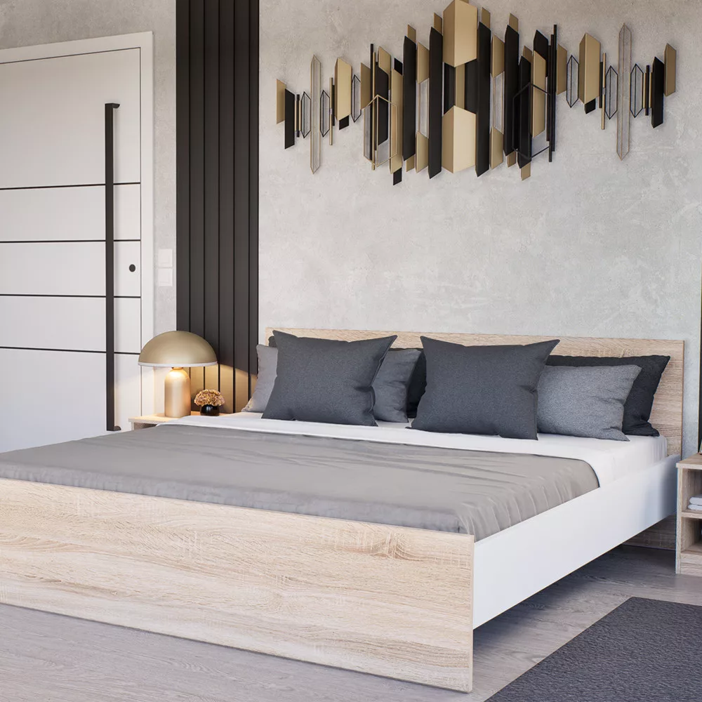 Wysokiej jakości płyta meblowa z białymi panelami bocznymi, wezgłowiem i szczytem łóżka w kolorze dąb sonoma. |