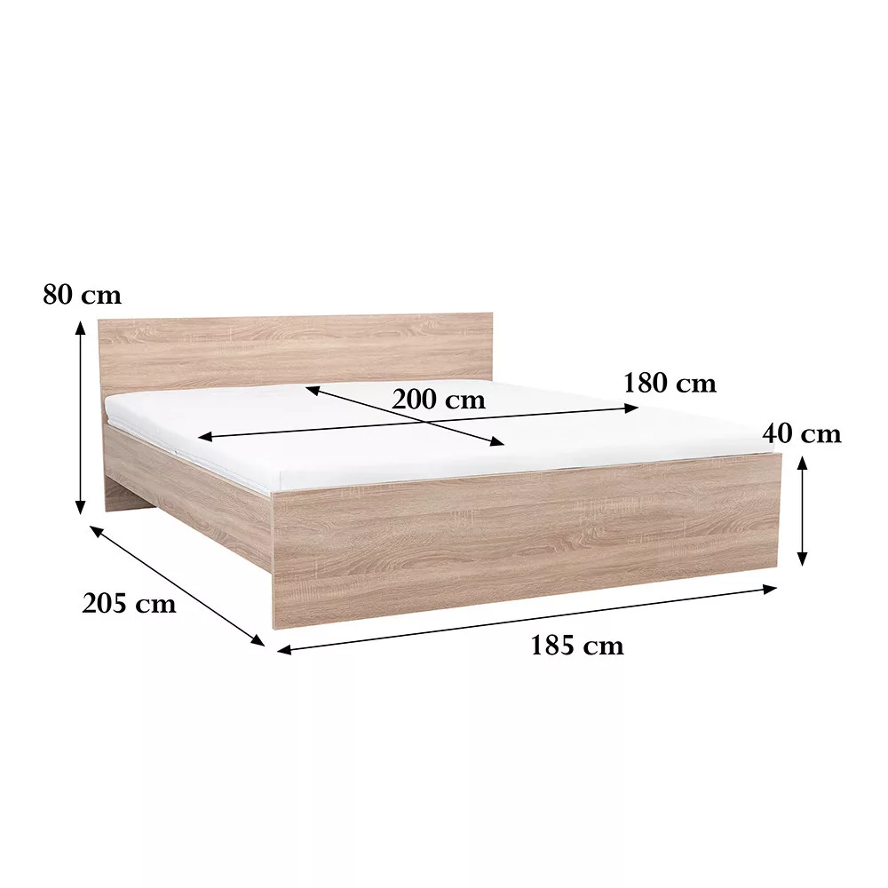Łóżko Miami wykonane jest z wysokiej jakości płyty meblowej z kredensem w kolorze dąb sonoma, wezgłowiem w kolorze dąb sonoma i zakończeniem łóżka. Rama łóżka ma wymiary 205 x 165 cm. Wymiary ramy łóżka: 80 x 185 cm. Wymiary materaca pasującego do ramy łóżka: 200 x 180 cm