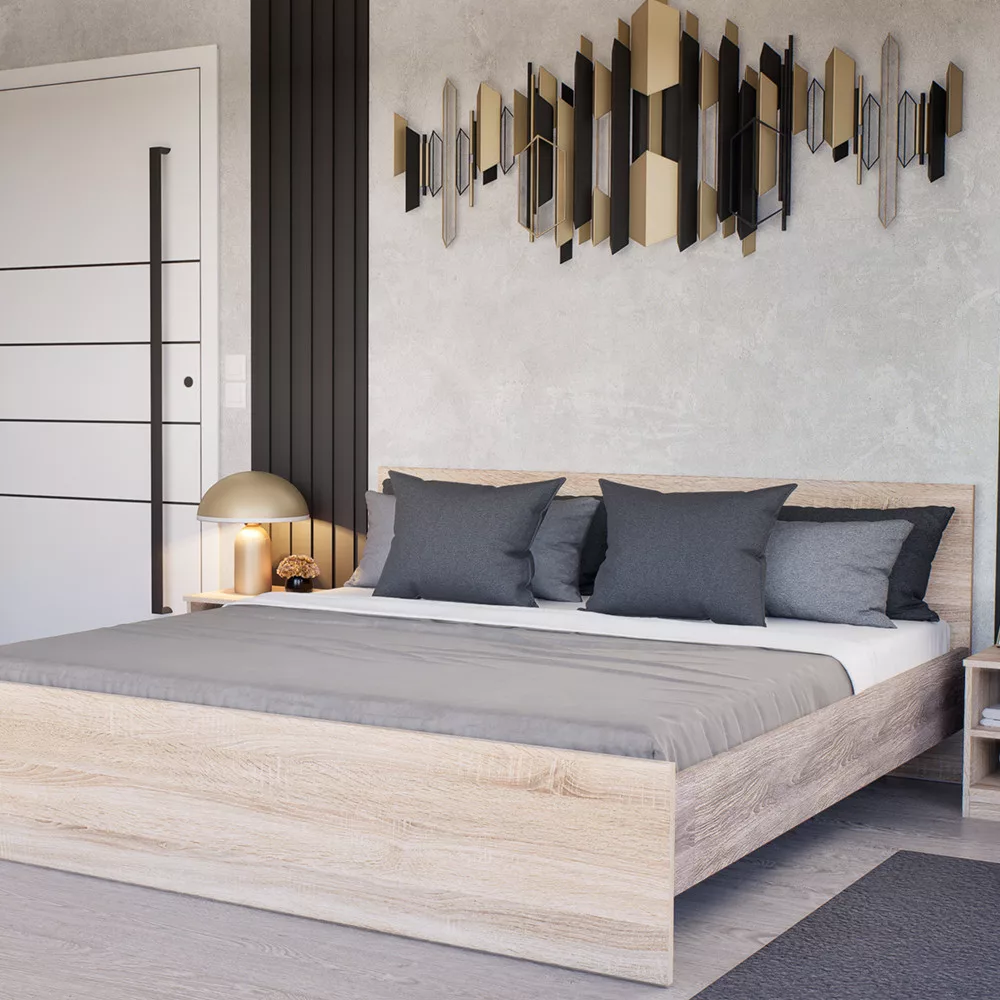 Wysokiej jakości płyta meblowa z bokami z dębu york, wezgłowiem i zakończeniem z dębu sonoma. |