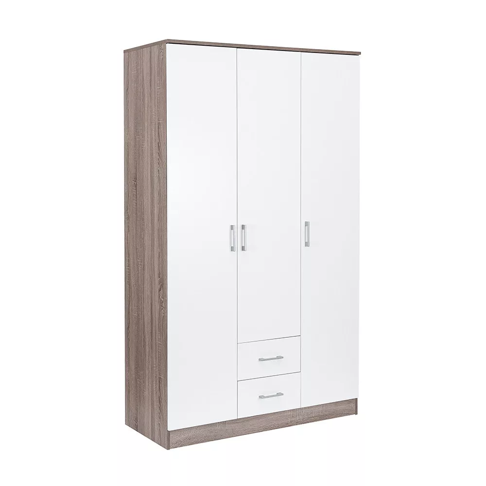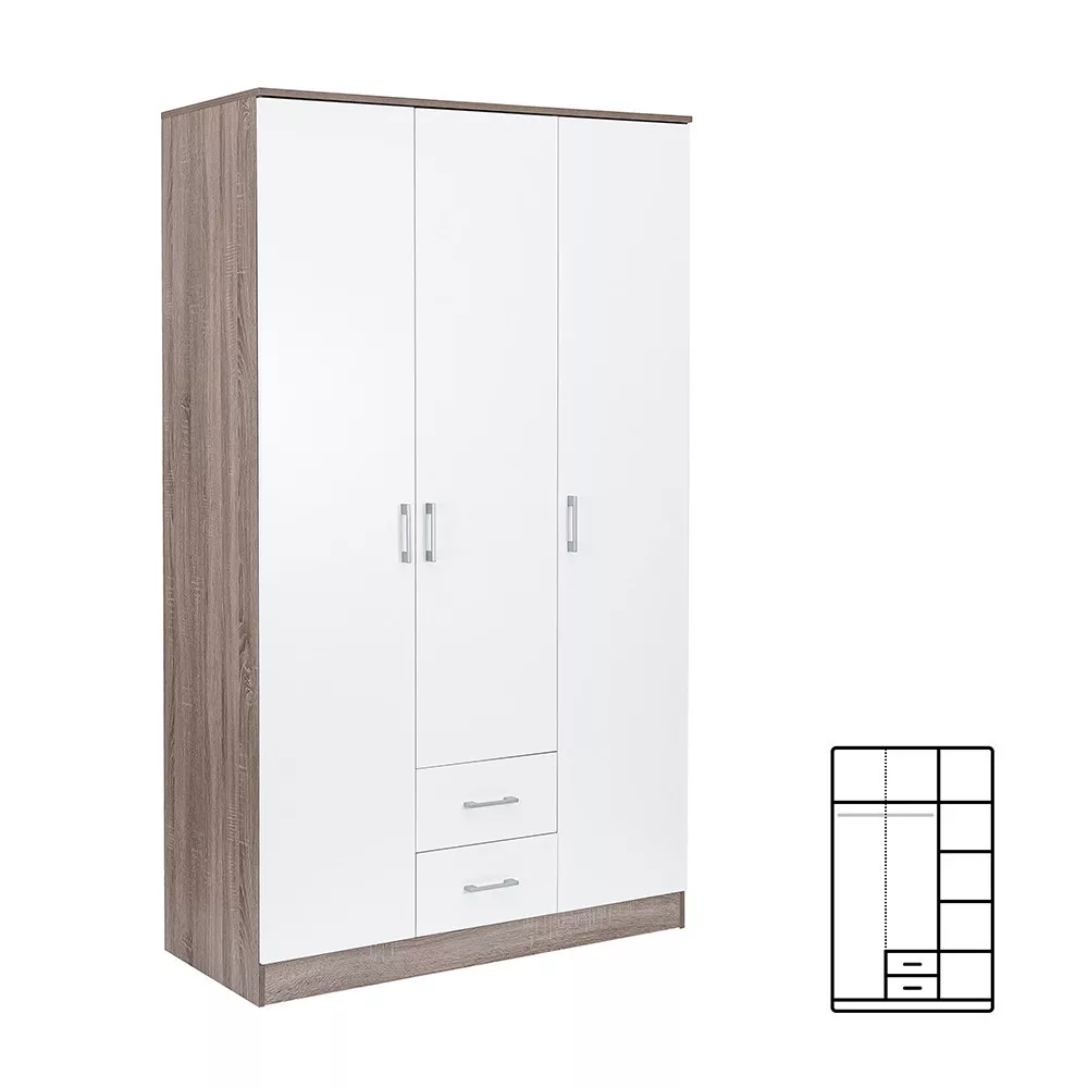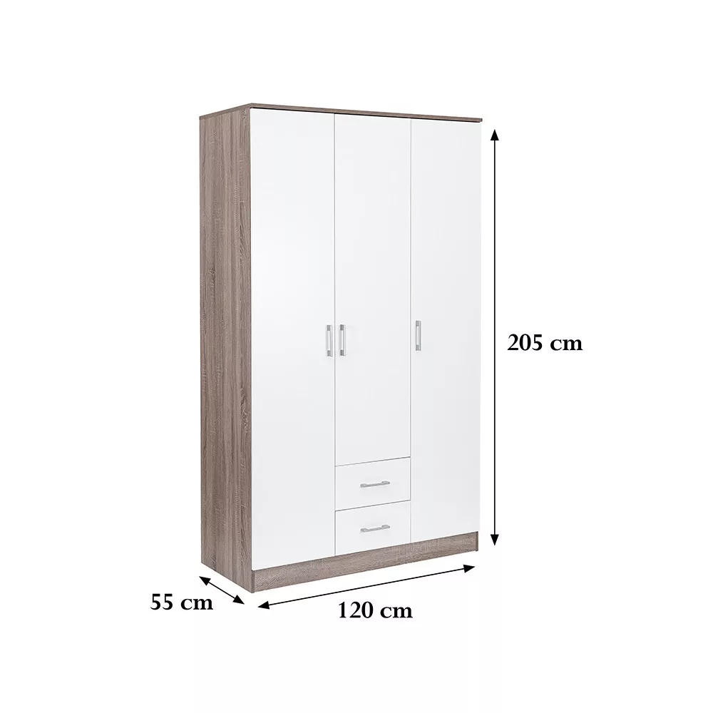 Połączenie eleganckiego białego frontu i drewnopodobnego korpusu w kolorze dąb york tworzy idealną harmonię w salonie lub sypialni. Szafa owysokości 205 cm, szerokości 120 cm i głębokości 55 cm to idealny wybór dla każdego, kto chce uporządkować swoje ubrania i akcesoria.
