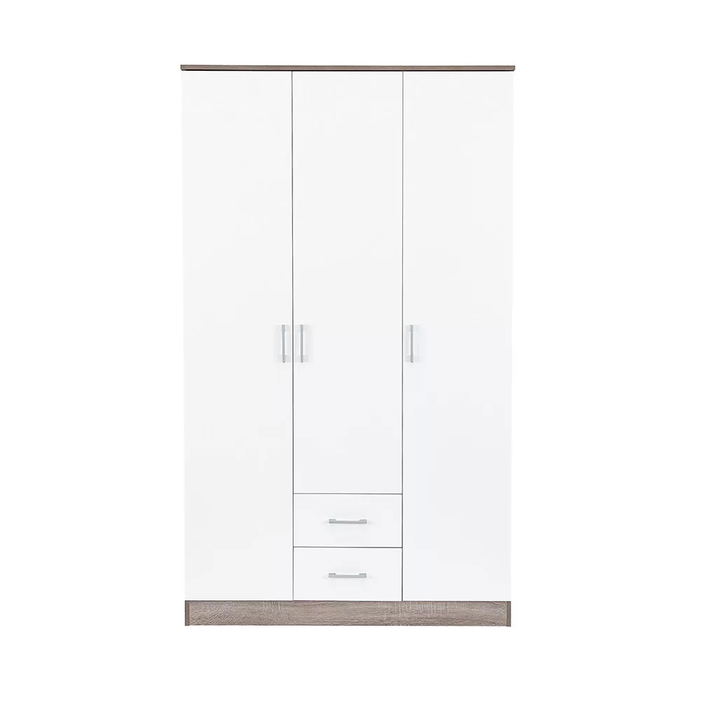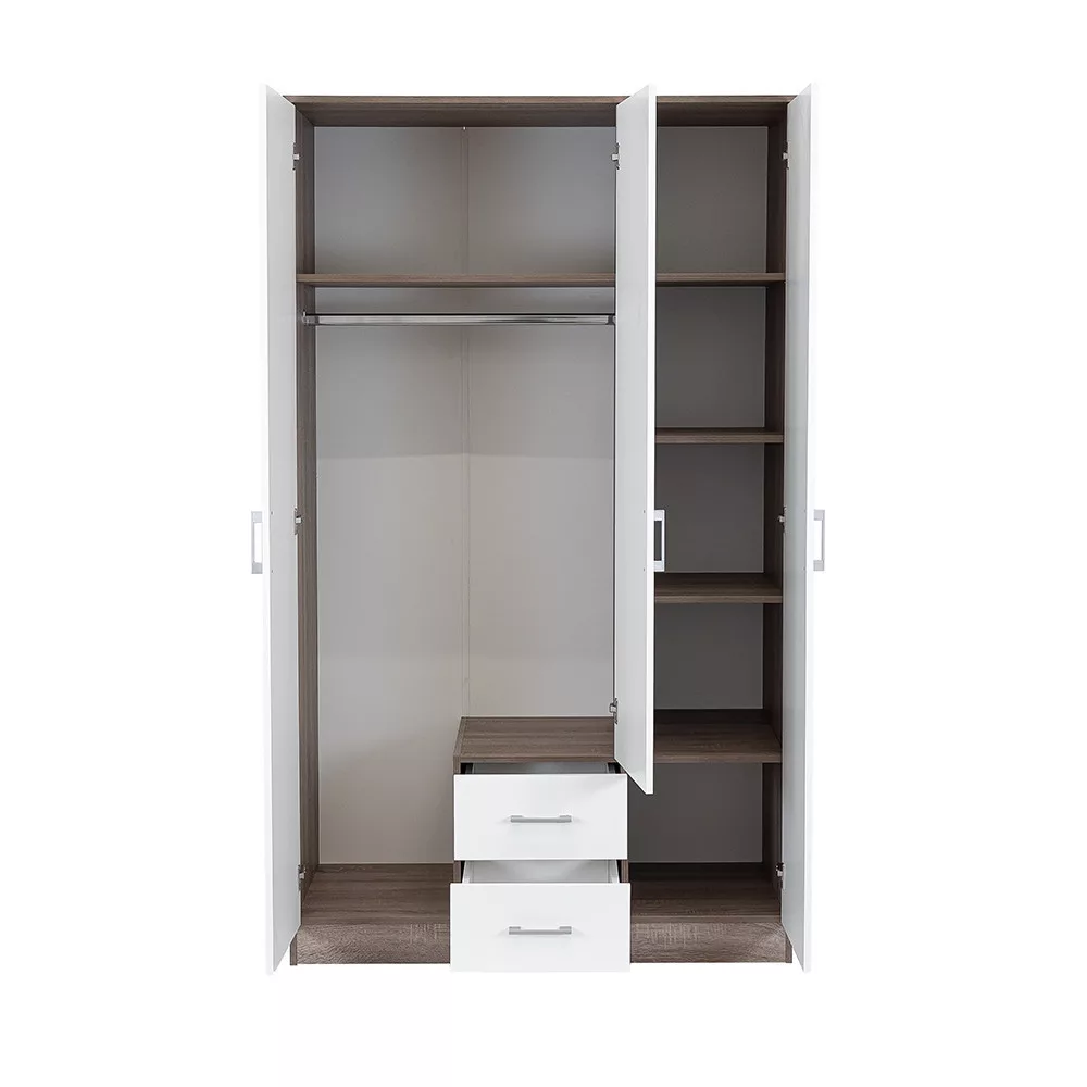 Plastikowe uchwyty z efektem matowego chromu nadają jej nowoczesny wygląd, adwuskrzydłowe otwierane drzwi i system półek sprawiają, że całe wnętrze szafy jest dobrze widoczne, dzięki czemu wszystkie ubrania i przedmioty są w zasięgu ręki. 6 półek idwie szuflady rolkowe zapewniają dużo miejsca do przechowywania pościeli, odzieży poza sezonem i bielizny.