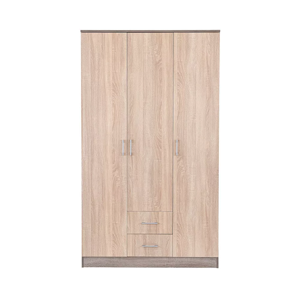 Plastikowe uchwyty z efektem matowego chromu nadają jej nowoczesny wygląd, adwuskrzydłowe otwierane drzwi i system półek sprawiają, że całe wnętrze szafy jest dobrze widoczne, dzięki czemu wszystkie ubrania i przedmioty są w zasięgu ręki. 6 półek idwie szuflady rolkowe zapewniają dużo miejsca do przechowywania pościeli, odzieży poza sezonem i bielizny.