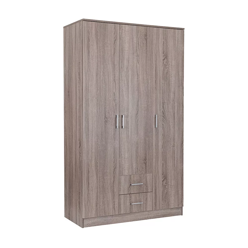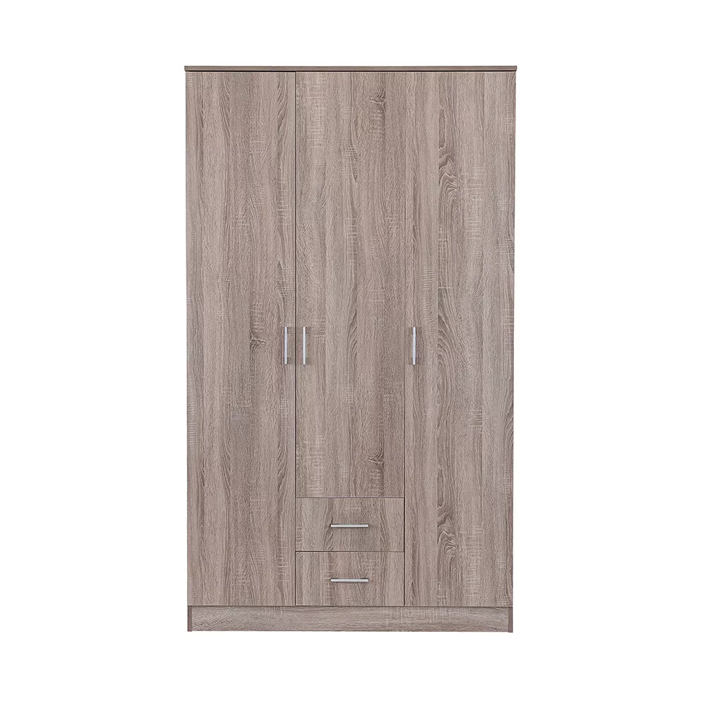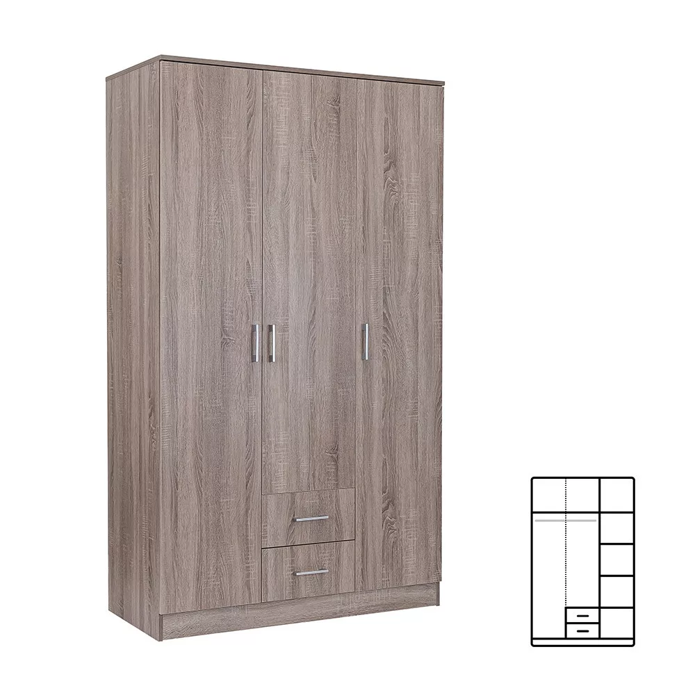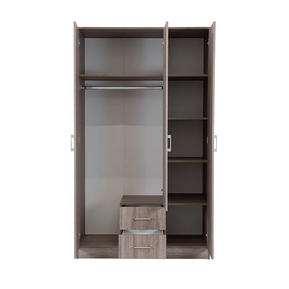 Plastikowe uchwyty z efektem matowego chromu nadają jej nowoczesny wygląd, adwuskrzydłowe otwierane drzwi i system półek sprawiają, że całe wnętrze szafy jest dobrze widoczne, dzięki czemu wszystkie ubrania i przedmioty są w zasięgu ręki. 6 półek idwie szuflady rolkowe zapewniają dużo miejsca do przechowywania pościeli, odzieży poza sezonem i bielizny.