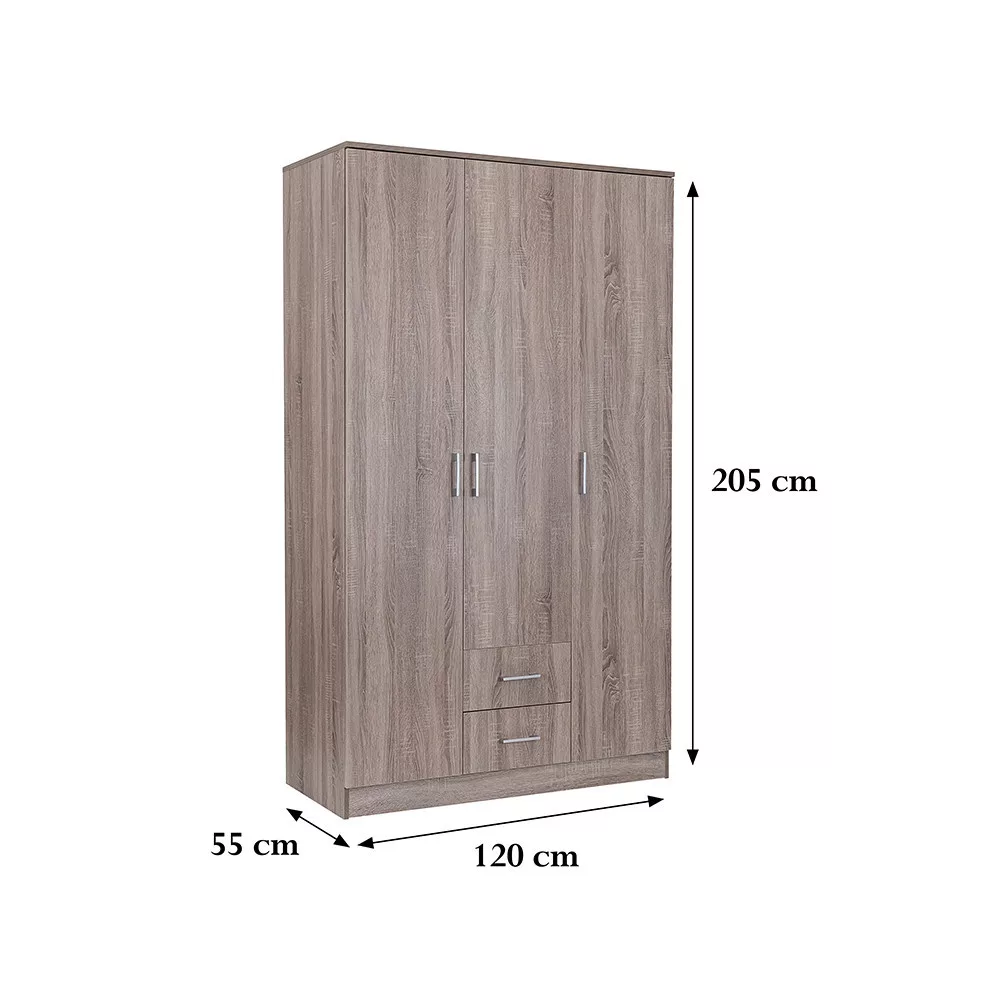 Połączenie eleganckiegofrontu w kolorze dąb york ikorpusu w kolorze dąb york z efektem drewna tworzy idealną harmonię w salonie lub sypialni. Szafa owysokości 205 cm, szerokości 120 cm i głębokości 55 cm to idealny wybór dla każdego, kto chce uporządkować swoje ubrania i akcesoria.