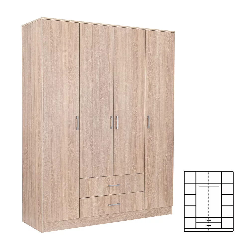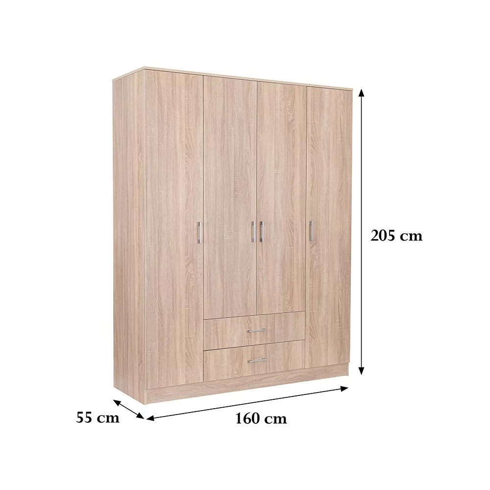 Połączenie eleganckiegofrontu w kolorzedąbsonoma zkorpusem w kolorze dąb sonoma z efektem drewna tworzy idealną harmonię w salonie lub sypialni. Szafa owysokości 205 cm, szerokości 160 cm i głębokości 55 cm to idealny wybór dla każdego, kto chce uporządkować swoje ubrania i akcesoria.